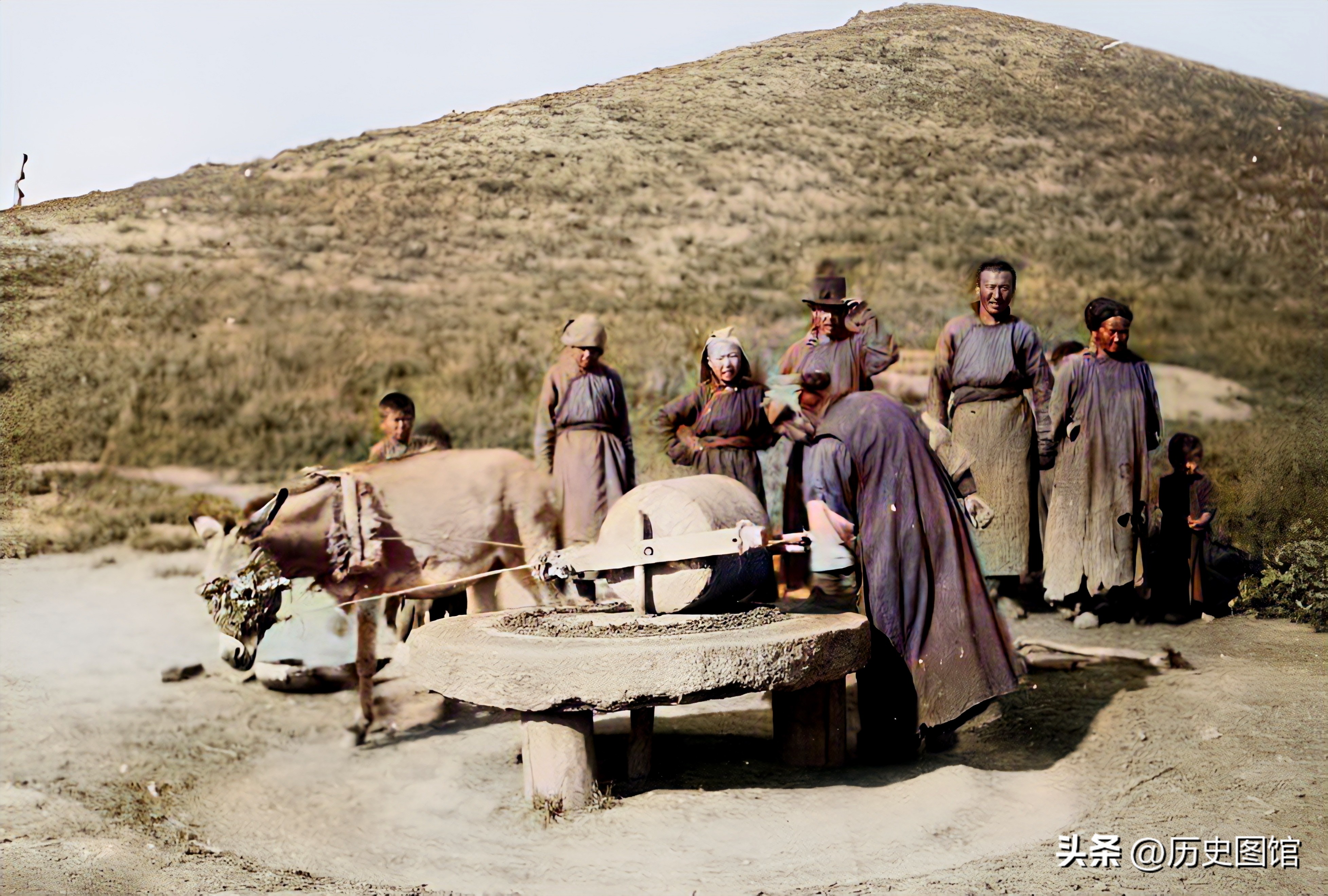 林西县郊外,一头小毛驴正拉着碾子转圈。几名村民在排队等候使用碾盘。