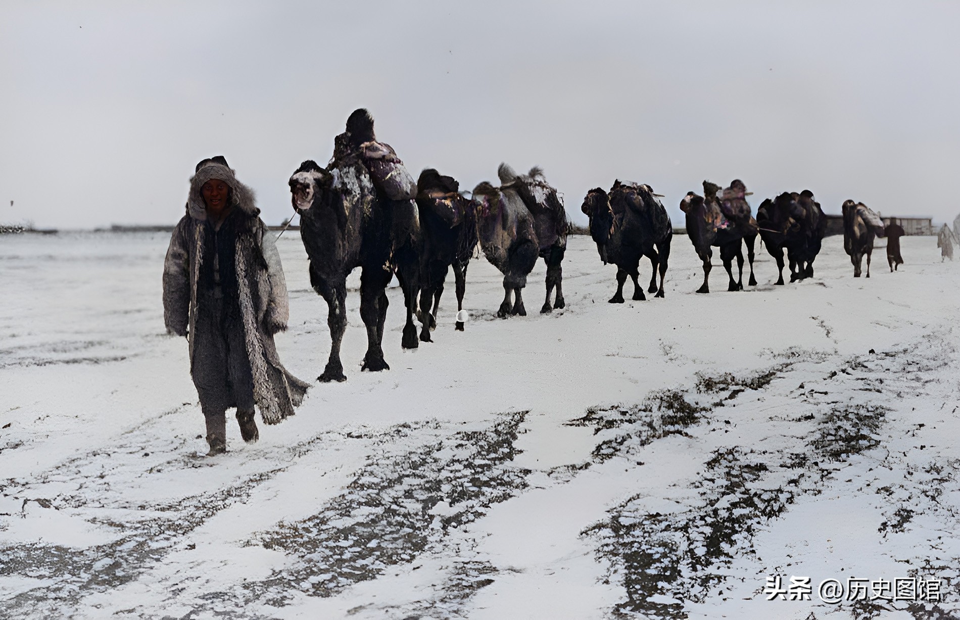 寒冷的冬天,内蒙古通辽白音太来郊外,地上的积雪还没有融化,一支驼队正在踏雪前行。