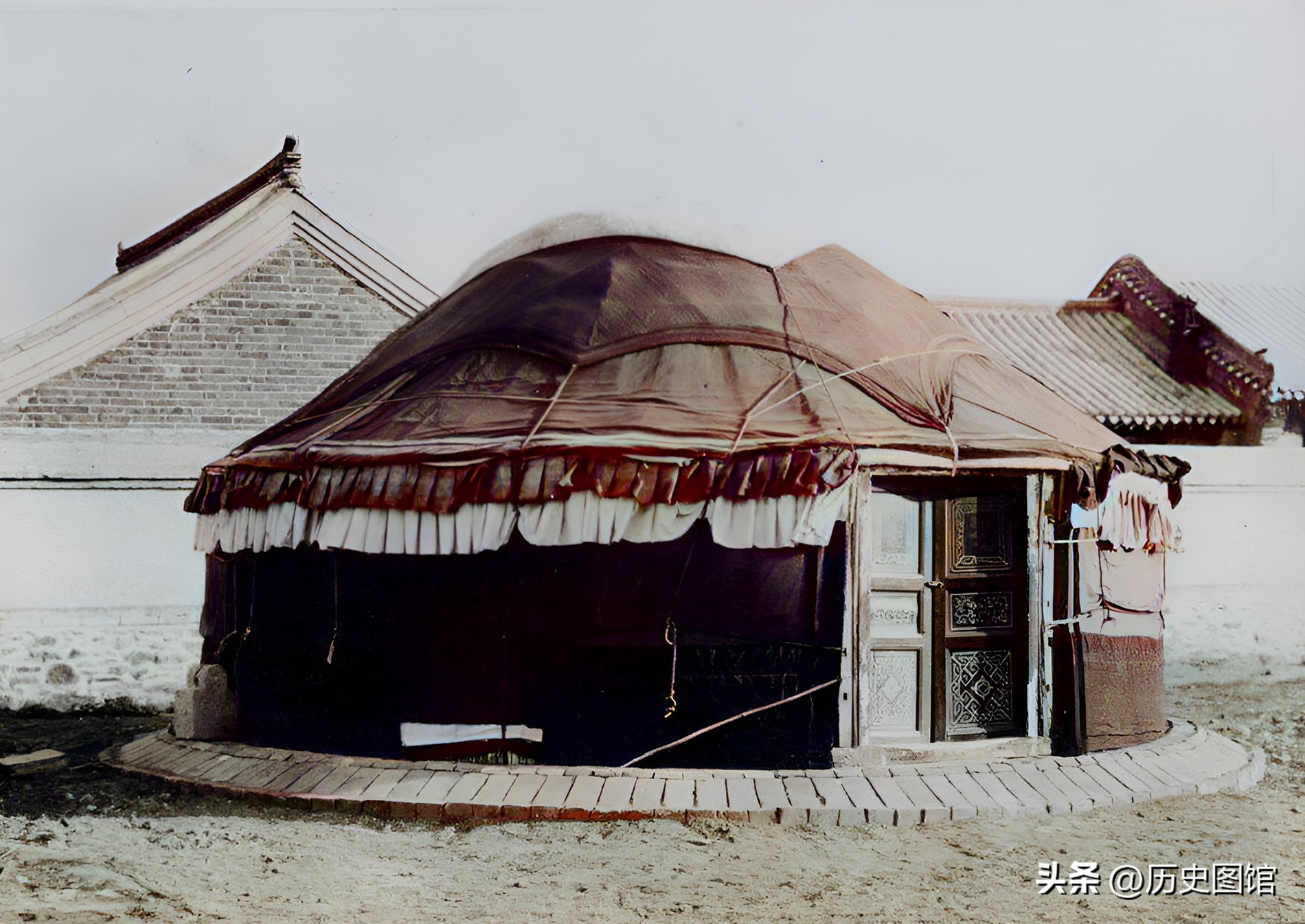 这张照片里,展示的是一个装饰豪华的蒙古包。蒙古包后面,是一个院落,有砖瓦房。