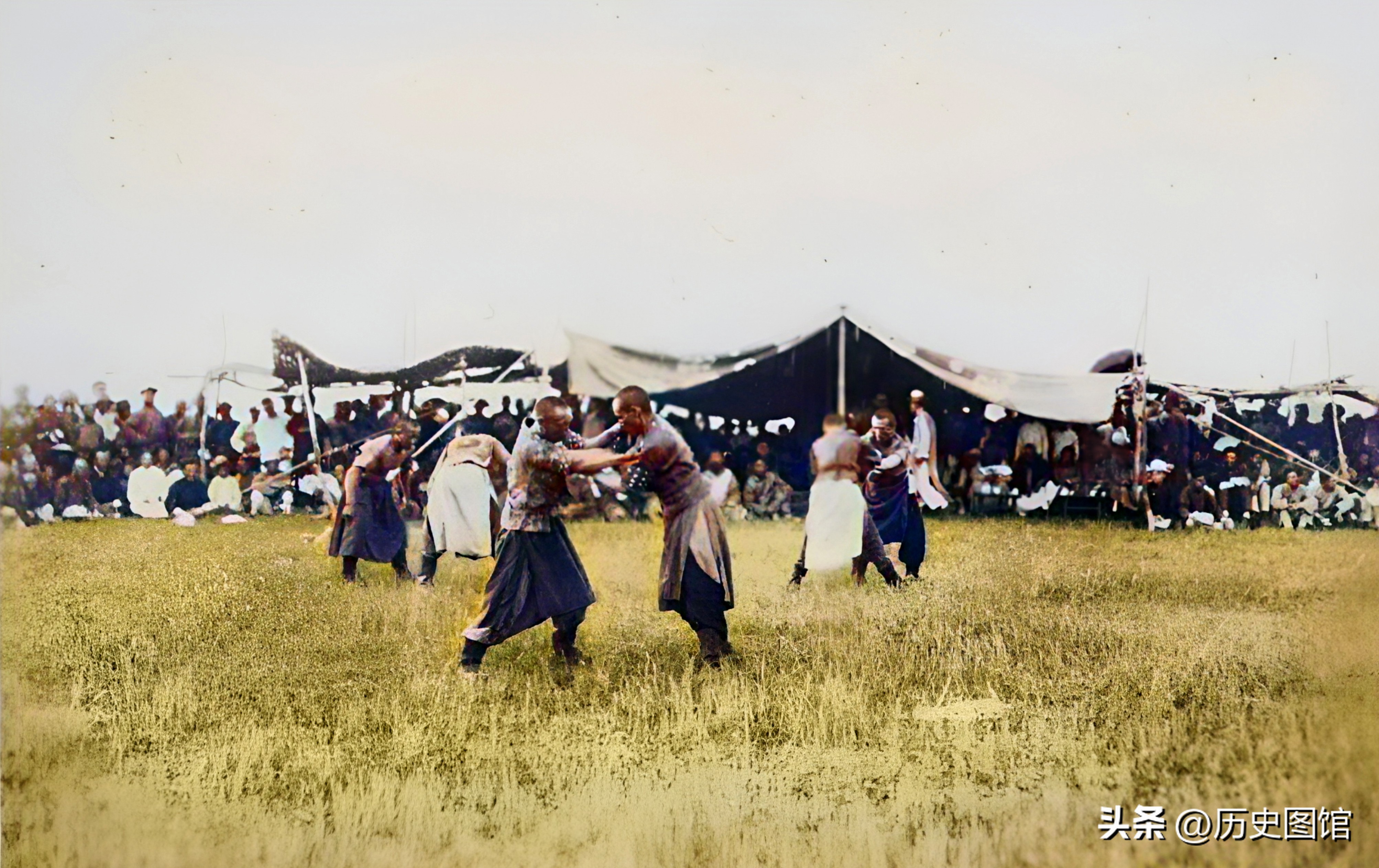 每年农历六月初四开始的传统节日"那达慕",是蒙古族人民的体育盛会。几对摔跤选手正在激烈较量。