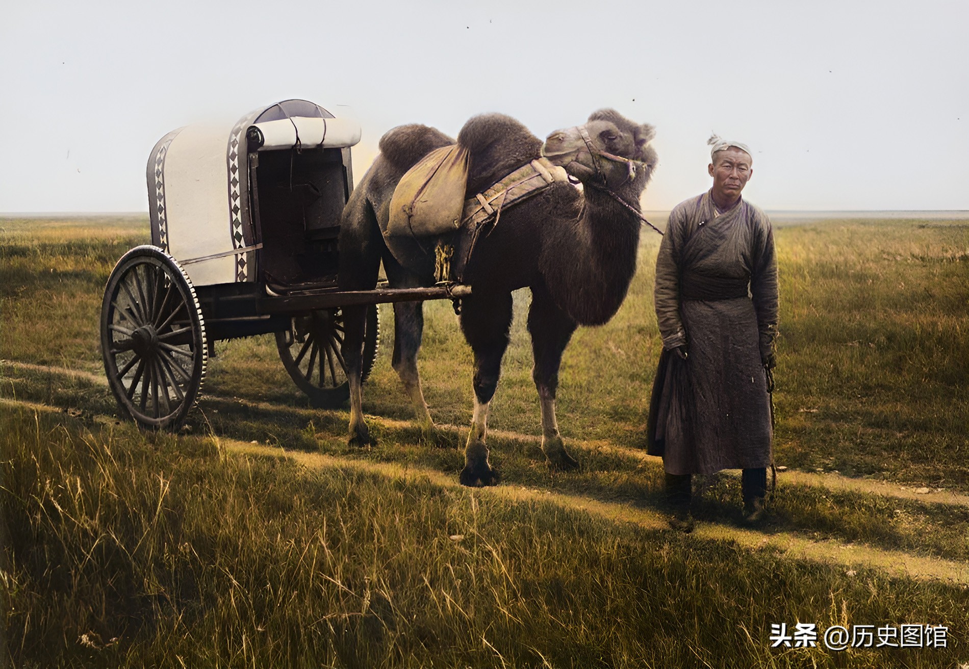前面看到草原的牛车,这张照片里,是一只骆驼拉着“勒勒车”,车上还有棚子。