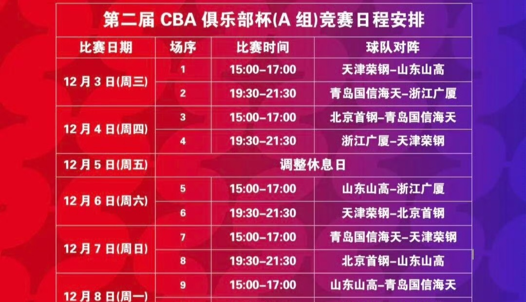CBA俱乐部杯:小组赛:2025年12月3日-8日,山东男篮分在A组,同小组的球队有北京首钢男篮、青岛男篮、浙江广厦男篮和天津男篮。