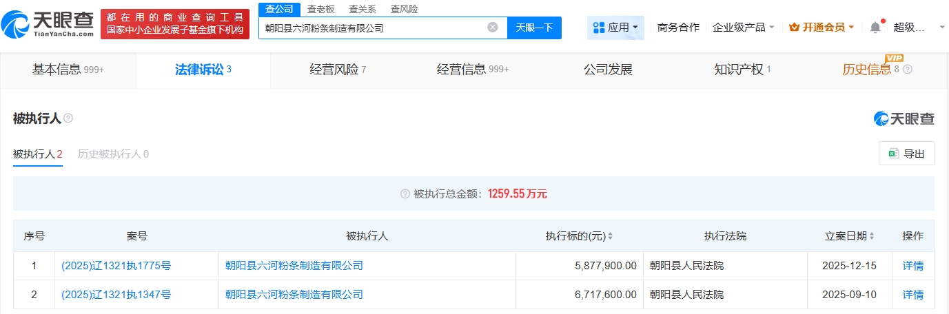 天眼查天眼风险信息显示,近日,朝阳县六河粉条制造有限公司新增1条被执行人信息,执行标的587.79万元,执行法院为辽宁省朝阳市朝阳县人民法院。