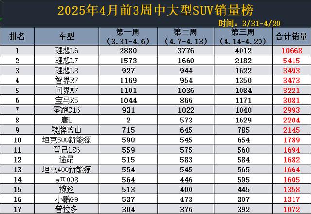 变天了!4月中大型SUV销量,理想包揽前3,唐L第8,豹8仅第19名