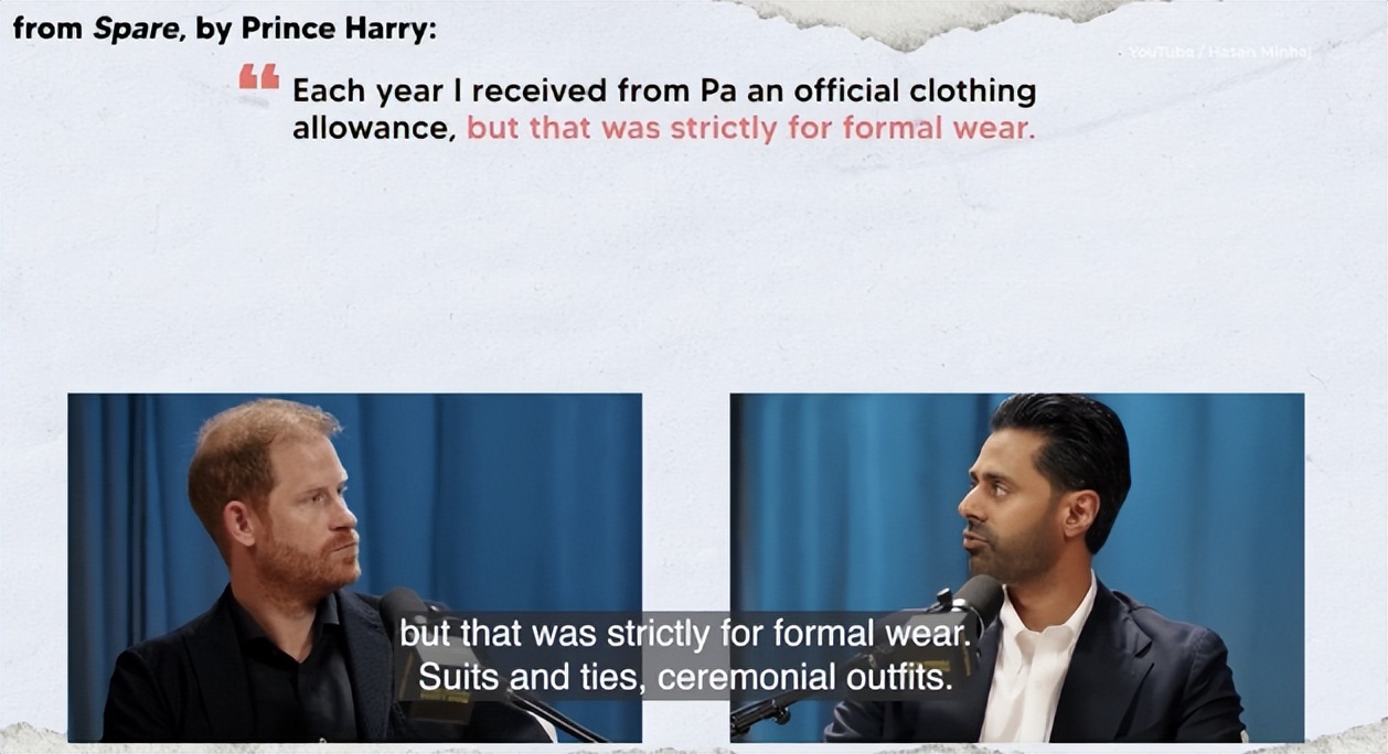 节目伊始,明哈吉直接翻出哈里的回忆录《备胎》片段当众朗读,书中哈里透露:“当年父亲查尔斯会给一笔官方服装补贴,但只限于正装,西装领带、礼仪服饰才能用。至于日常休闲装,全靠折扣店淘货,尤其痴迷每年一度的大促,总能淘到一些品牌的过季或轻微瑕疵款。”