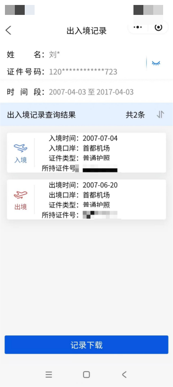 (出入境记录,刘女士提供)