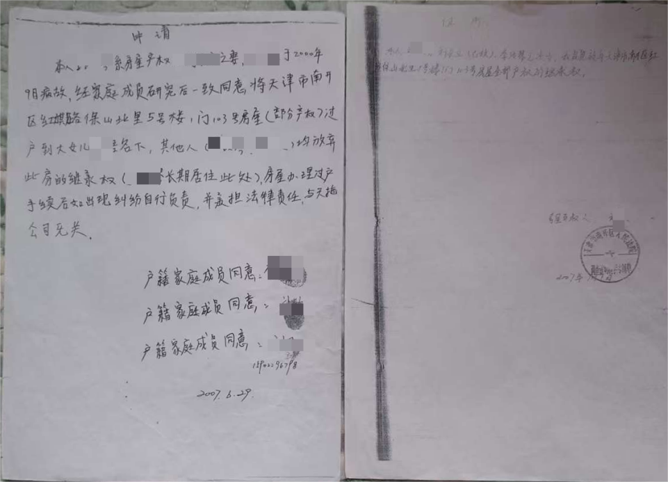 刘某的父亲于2000年去世,留有天津市南开区部分产权房屋一套,该房产属于刘某法定可继承的遗产范畴。2007年6月29日,一份标注刘某“自愿放弃继承权”的《申请》及后续《证明》被出具,涉案房产随后被过户至其姐姐名下,两份文件均有“刘某”签名及手印。