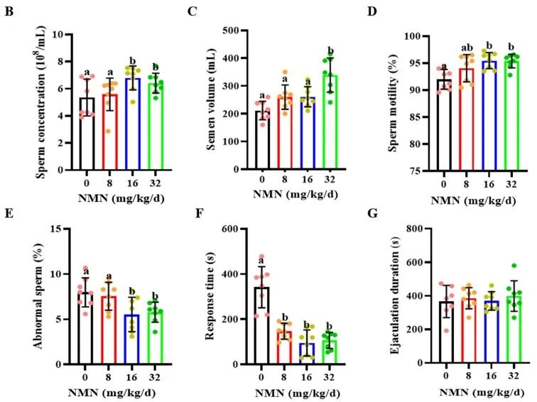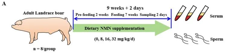 为了探究NMN对公猪精子质量的影响,研究人员选取了32头公猪,随机分成四组,分别喂食含有不同水平NMN(0、8、16、32 mg/kg/d)的饲料,持续9周。