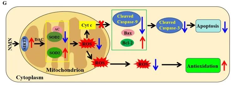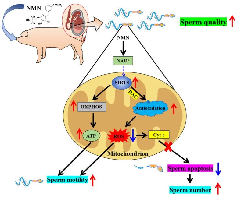整个NMN的作用机制,其实是NMN通过激活SIRT3上调OXPHOS和抗氧化蛋白水平来提高ATP的产生和降低ROS水平,从而提高精子的生存能力,并通过SIRT3/Cyt c/caspase-3和-9信号通路抑制精子凋亡,从而增加精子数量。