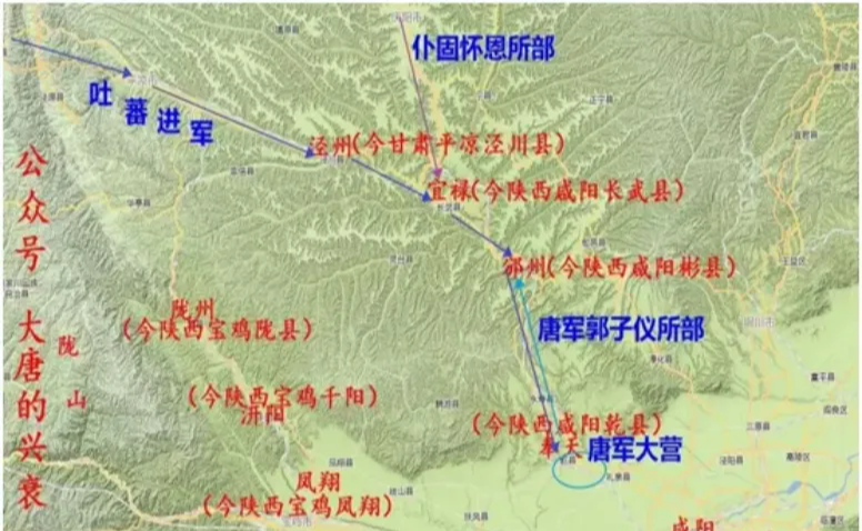 765年8月,仆固怀恩第二次诱导回纥、吐蕃入寇,当时唐廷西路凤翔、东路河中的部队都被牵制,中路即将被打穿,但仆固怀恩此时半路暴卒于鸣沙,叛军余部发生内讧火并,一时半会没办法继续南下,郭子仪巧使计谋说服回纥,使其注意到吐蕃由于吞并了河西陇右实力暴涨,若继续与其合作对回纥不利,因此回纥同意和唐朝合作打击吐蕃才解决此次危机。