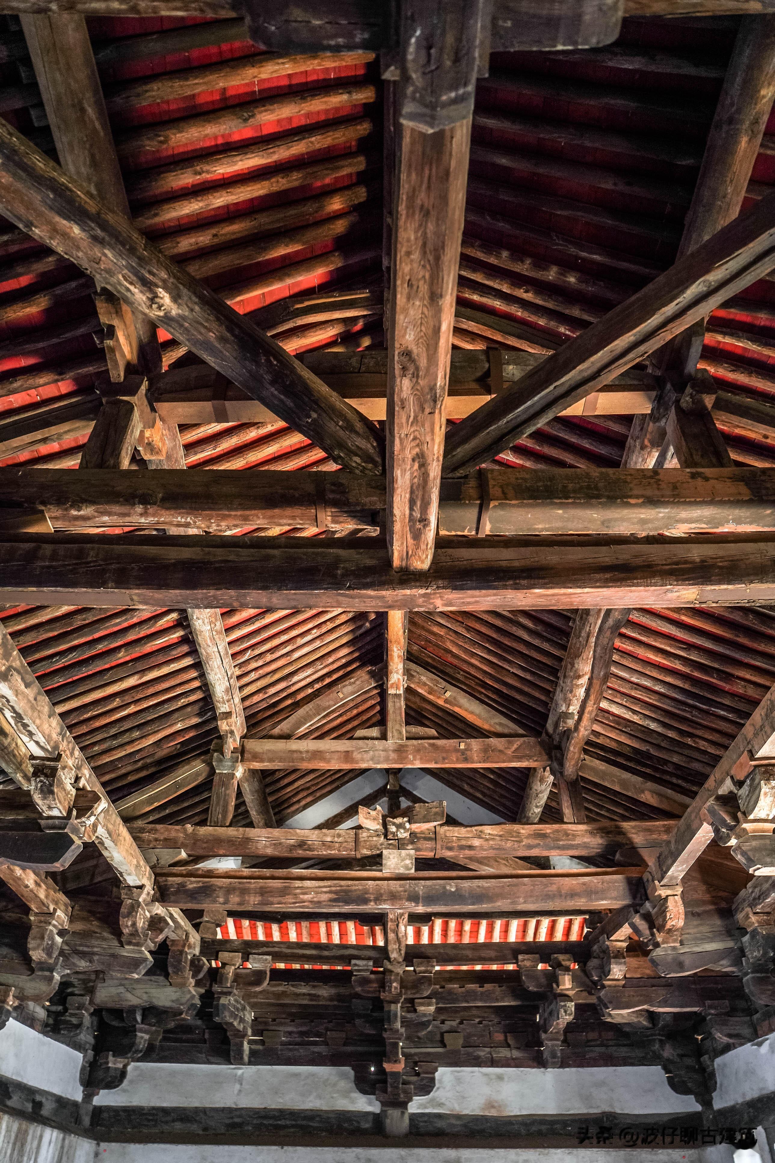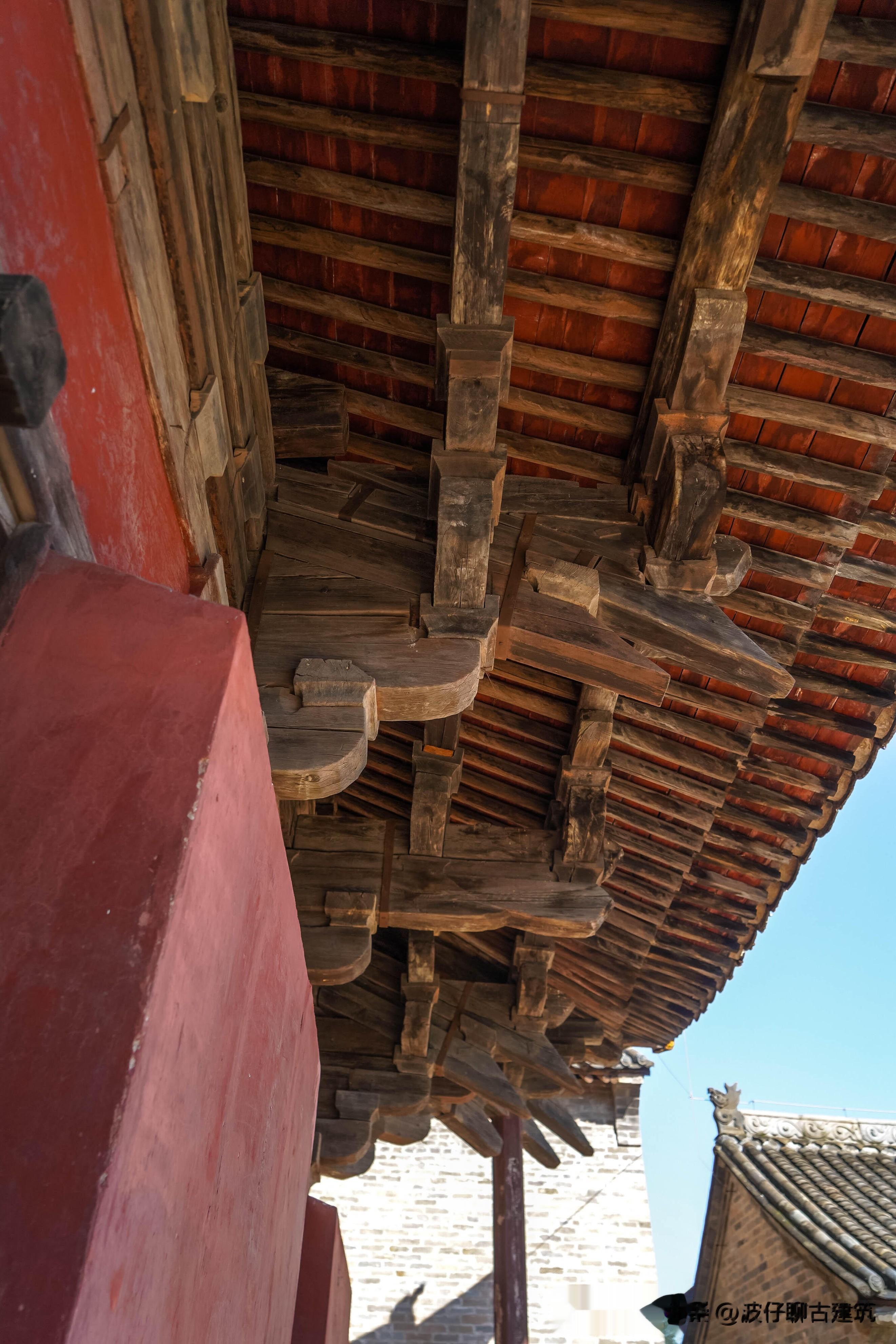 从中佛殿出来,往后走便是后殿,这座建筑与中佛殿形成了奇妙的对比,仿佛是两种建筑哲学的对话。后殿创建年代无考,重修于明万历十九年,现存的建筑面阔五间,进深六椽,单檐悬山顶,虽然经过明代的修葺,但骨子里仍保留着元代的粗犷风格。如果说中佛殿是“小材大用”的精巧典范,那后殿便是“大材小用”的豪放代表。殿内的梁架选材极为粗大,木材的纹理清晰可见,甚至不修边幅,透着一种原始的野性与古朴。这种粗犷的风格,与中佛殿的纤细精巧形成了鲜明反差,让人不禁好奇,为何同一座寺院里,会出现两种截然不同的建筑理念。
