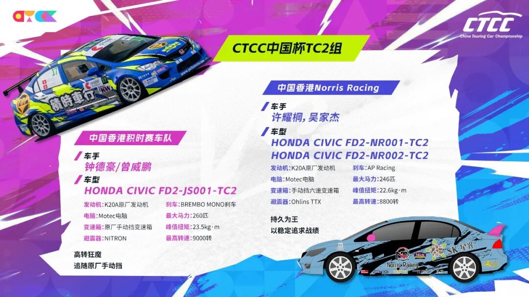 当同款思域FD2出现在CTCC中国杯TC2组的发车格上,我们看到的不仅是两支车队的较量,更是一段关于坚持与热爱的故事。中国香港积时赛车队用多年时间打磨一台车,将FD2的潜力推向新高;中国香港Norris Racing用三个赛季的稳定表现,证明了“稳”也是一种速度。他们或许不是全场最快的,但一定是围场里最懂得与经典对话的车队。