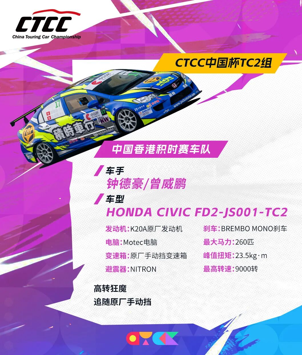 中国香港积时赛车队的HONDA CIVIC FD2-JS001-TC2赛车搭载K20A原厂发动机,但通过强化稳定性与Motec电脑调校,将最高转速推至9000转,最大马力达到260匹,峰值扭矩23.5kg·m。配合NITRON避震、BREMBO MONO刹车以及原厂手动变速箱,尽力达到性能与稳定性的极致平衡。车队表示,“原厂手动挡”令比赛中的换挡操作颇具挑战性,但这种纯粹也让他们在TC2组中独树一帜。