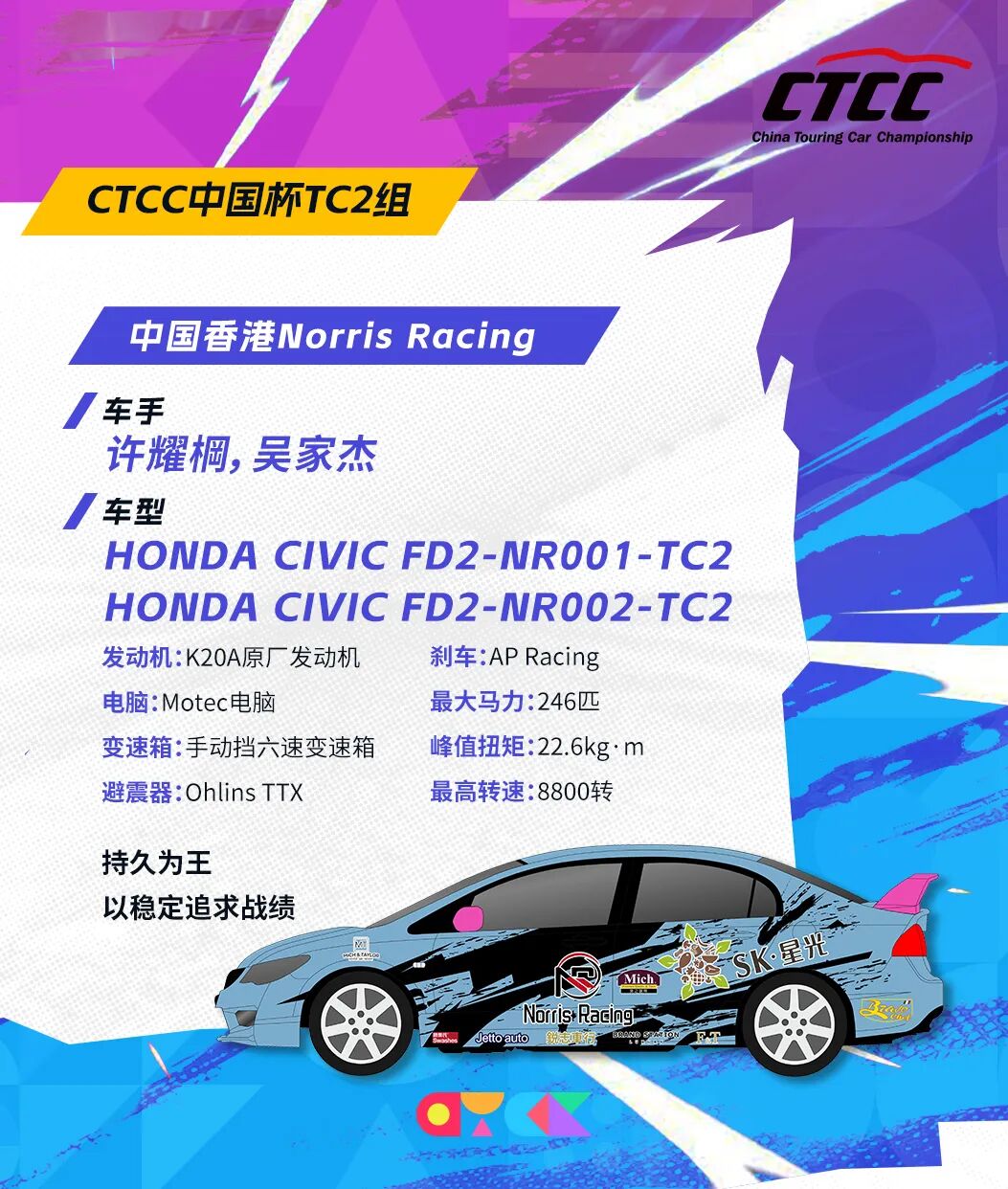 《破晓擎声之CTCC参赛阵容》系列已经来到第三期。本期,我们将目光投向CTCC中国杯TC2组的两支实力之师:中国香港积时赛车队与中国香港Norris Racing。