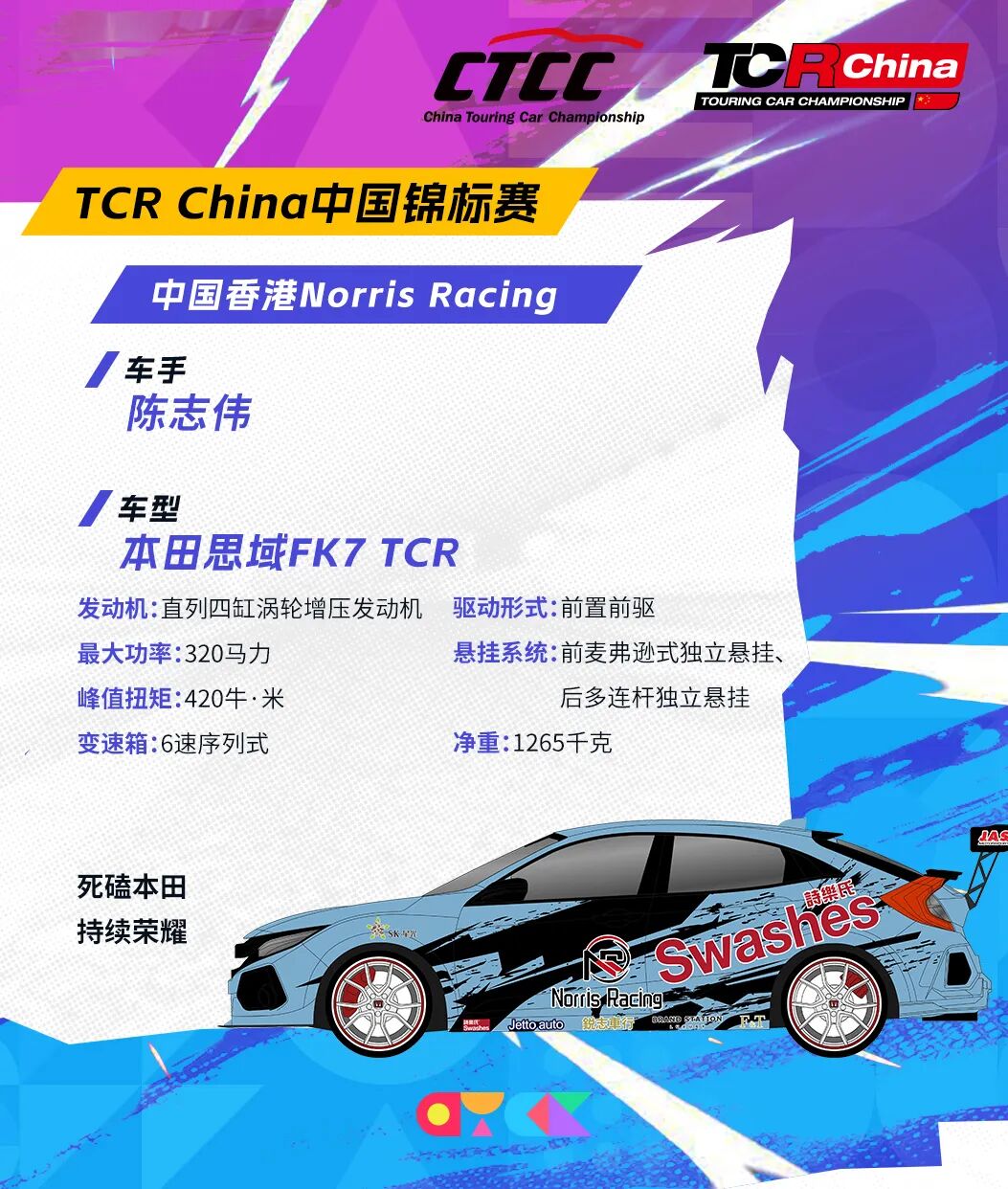 中国香港Norris Racing对思域的喜爱还延续到TCR赛场。陈志伟在本赛季将继续为车队披挂上阵,驾驶基于第十代思域打造的本田思域 FK7 TCR赛车参与TCR中国锦标赛,期待在这个熟悉的舞台再取突破,也体现了车队对思域车系的偏爱。
