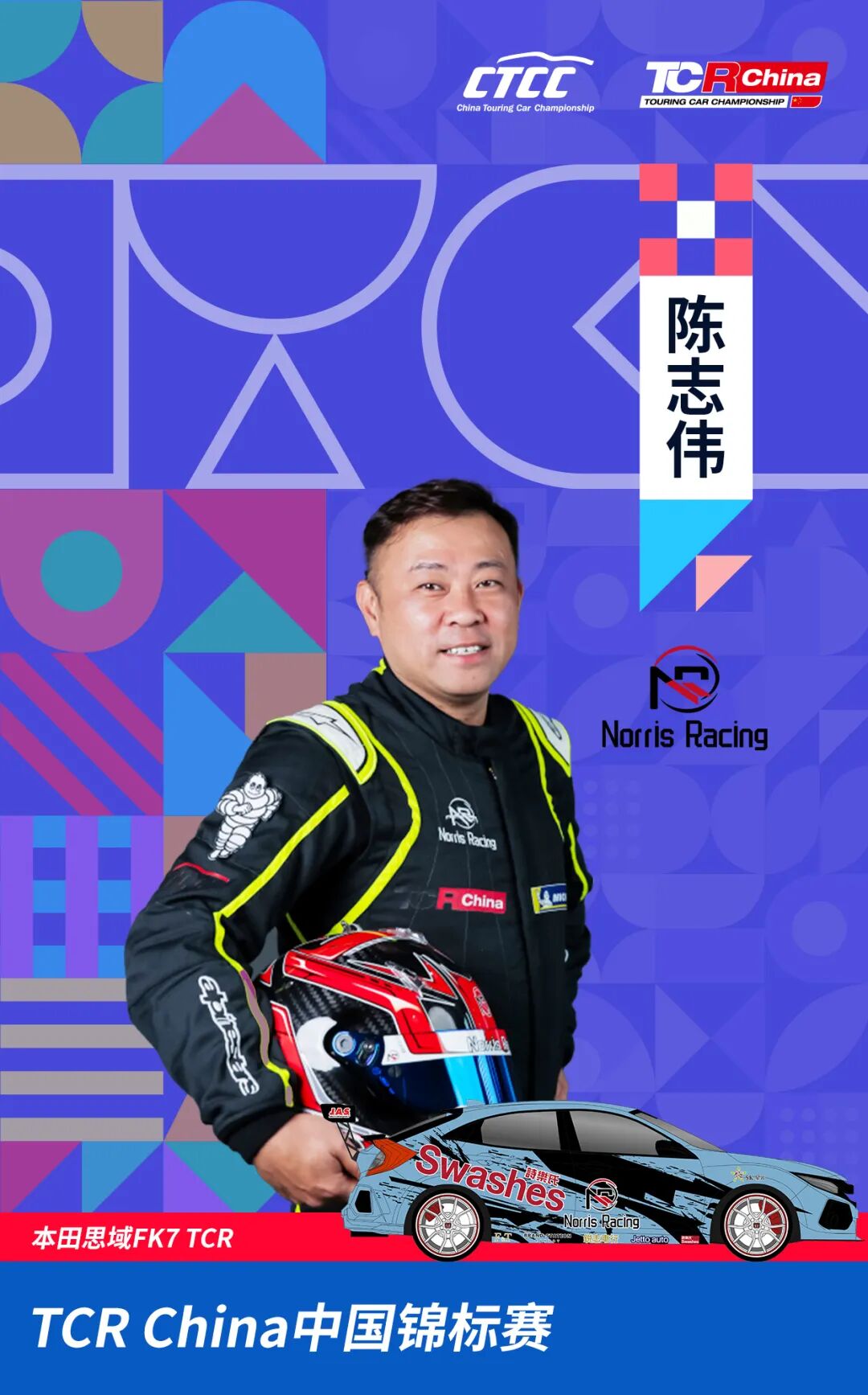 陈志伟将连续第四年参与CTCC。作为车队的核心车手,陈志伟在2023赛季首秀CTCC,一直活跃在TCR中国锦标赛的舞台,在三年的征途中不断进步,多次稳健斩获积分,有望在新赛季再迎突破。