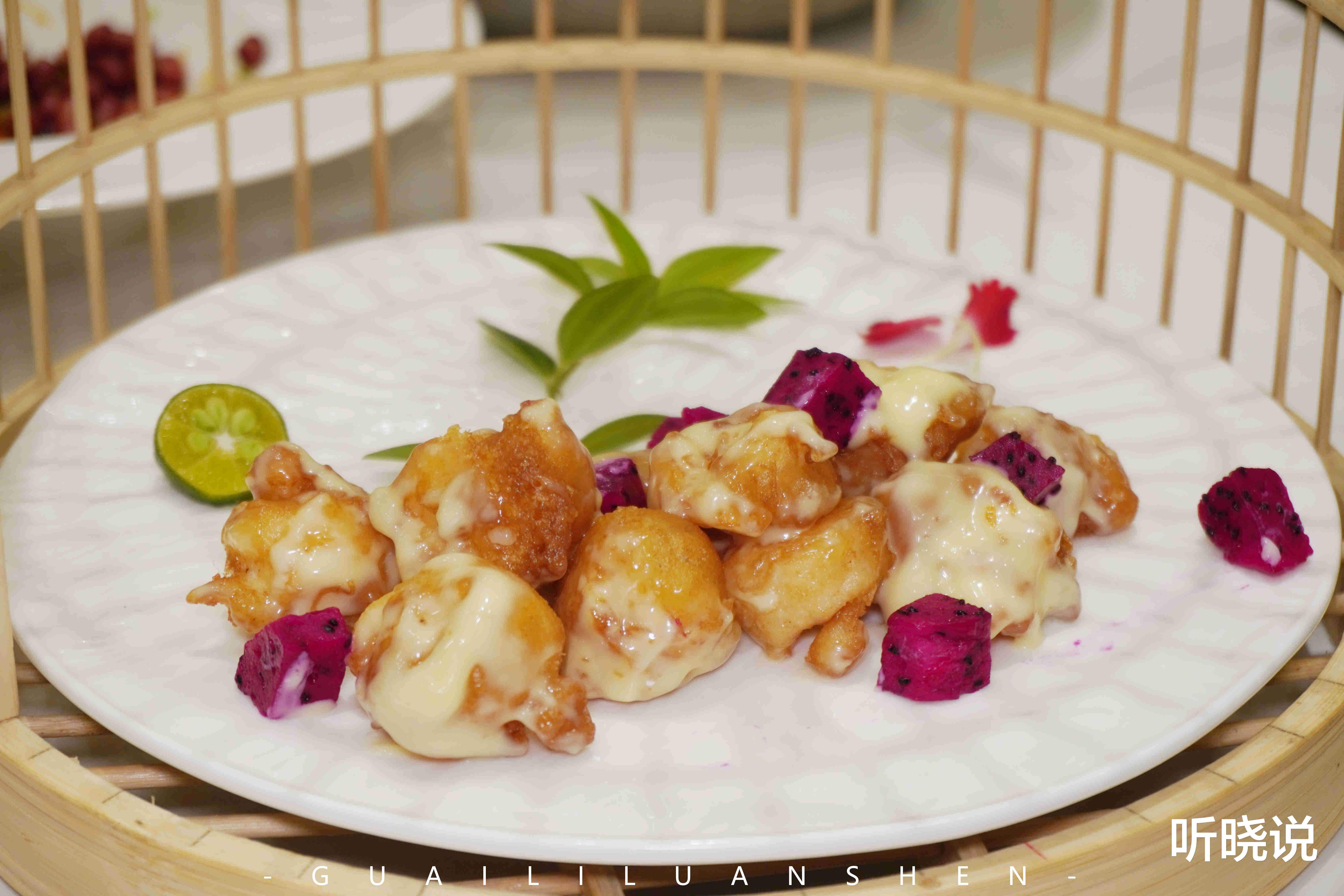奇妙虾球的摆盘相当精致,连鸟笼都搬上餐桌了。炸的金黄酥脆的外皮搭配沙拉,吃起来爽口又好吃。
