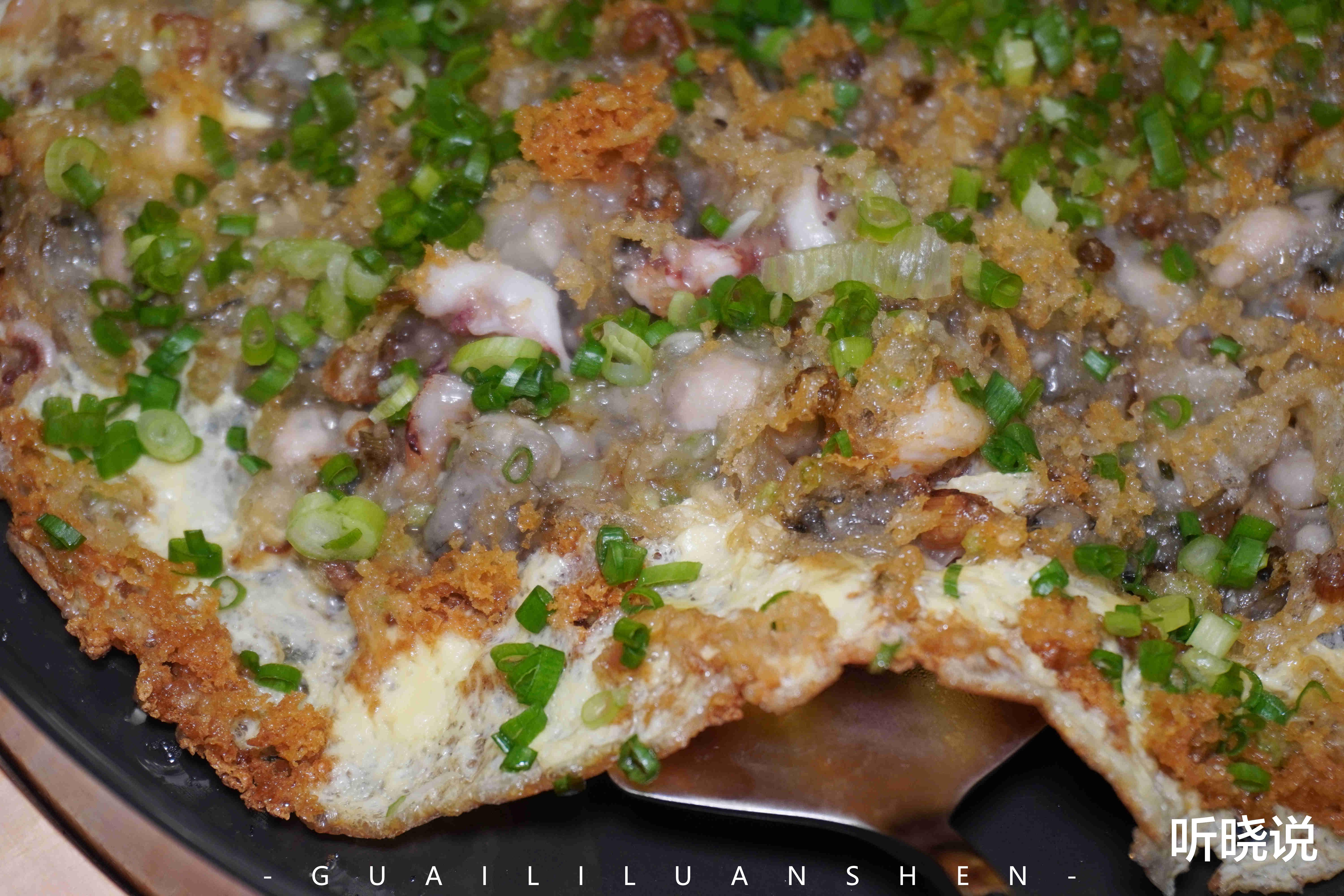 金牌蚝仔烙有点像闽南的海蛎煎,外皮煎的金黄焦脆,加入新鲜的鱿鱼后口感更鲜美,也更丰富了。