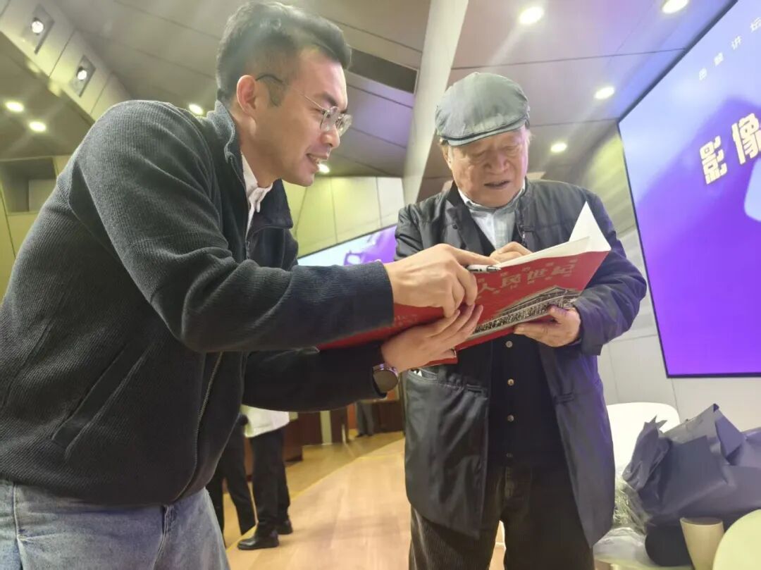 讲座尾声,85岁高龄的朱宪民先生依然思维敏捷、神采奕奕,他向台下深深鞠躬,与观众频频互动,现场气氛愈发热烈,一位青年学子挤到台前,捧着红色封面的《人民世纪》摄影集请求签名。朱宪民先生在扉页郑重写下寄语,还与他亲切合影留念。