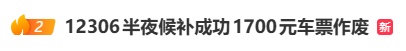 有网友报料,其在购买厦门至宜兴返程票时,凌晨3点才收到候补成功通知,因熟睡未及时查看,醒来时列车已发车,近1700元车票无法全额退款。当事人表示,自己因抢票无果,便提交了多趟车次的候补订单,临近出发仍无票,无奈加价“多买几站”才成功购票,却没想到凌晨系统突然兑现此前的候补订单。