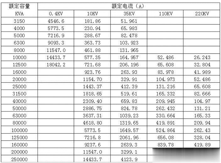 各种容量变压器高低压侧额定电流的数据(包括20、30、50、80、100、160、200、250、315、400KVA等)