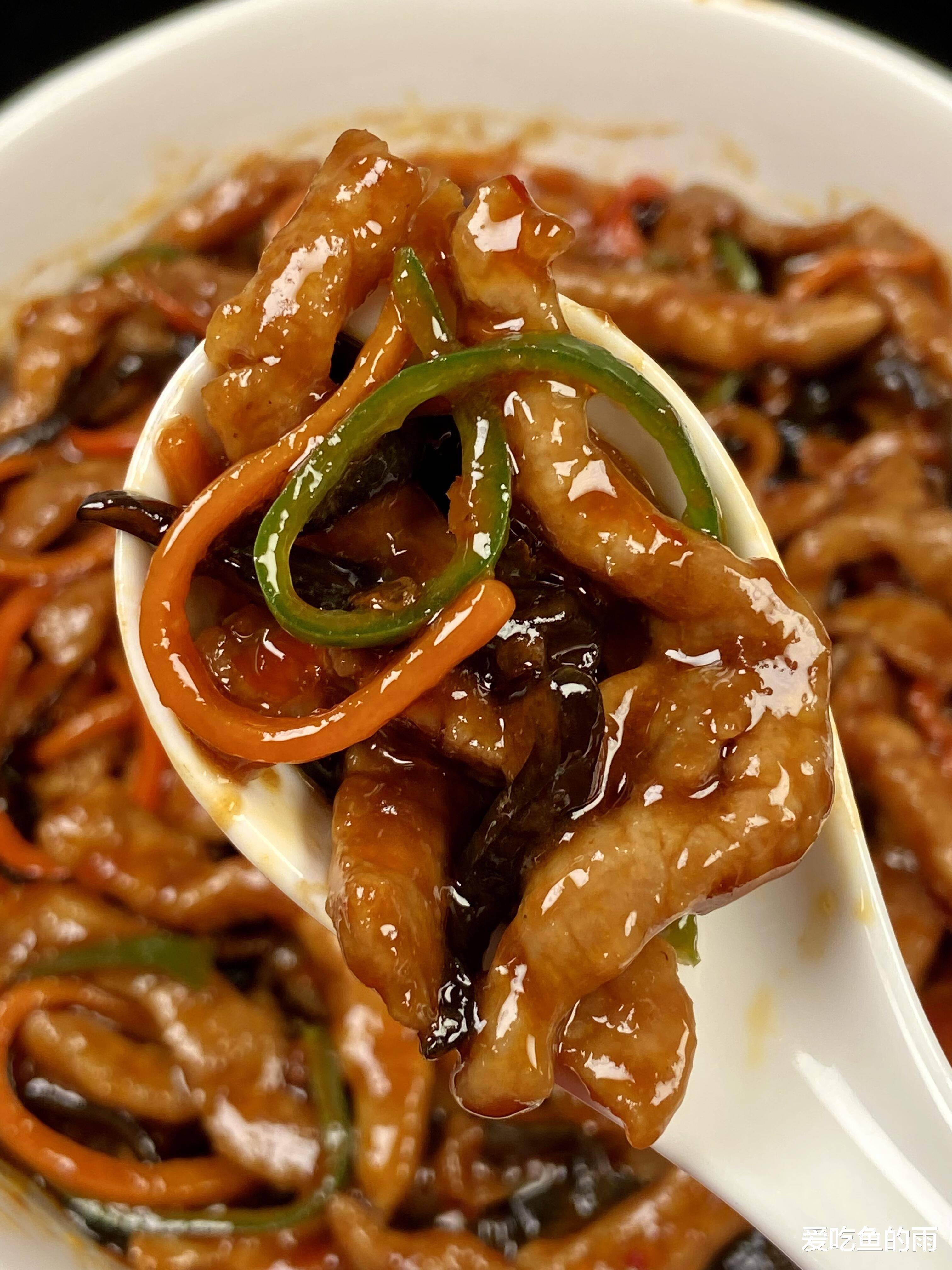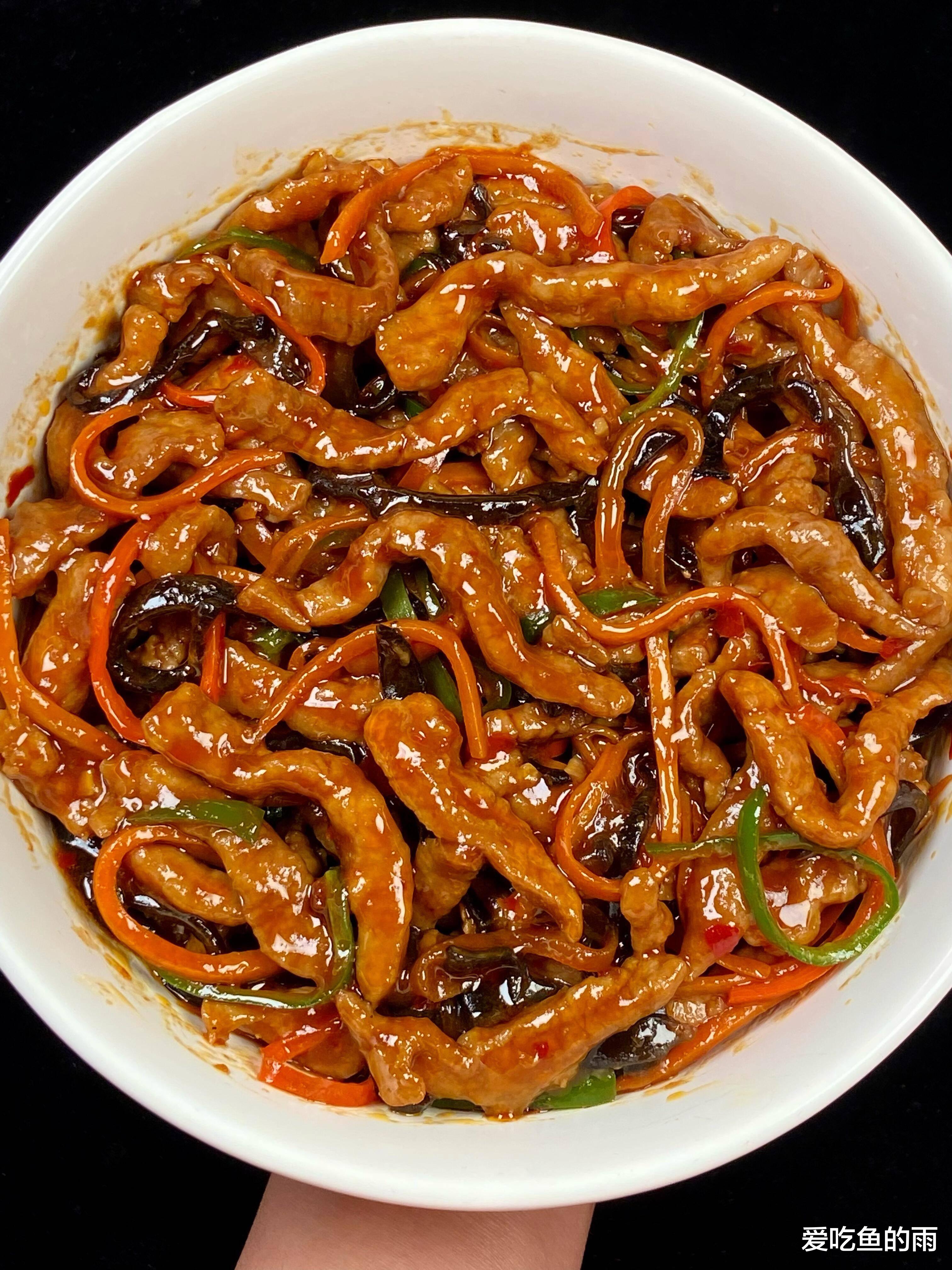 炒的时候火候得盯紧:先下肉丝滑散,变色就盛出;再炒泡椒姜蒜,香味一出来就放木耳、胡萝卜、青椒,翻炒两下倒回肉丝,淋上鱼香汁,大火收汁——整个过程不过三分钟,晚一秒肉丝就老,早一秒味不透。第一次自己做时,手忙脚乱把糖放多了,甜得发腻;第二次醋放少了,又少了那股鲜劲儿。直到第三次,妈妈在旁边盯着:“起锅前淋点明油!”嘿,红亮的酱汁裹住每根丝,香味“轰”地窜出来,和馆子里的一模一样。