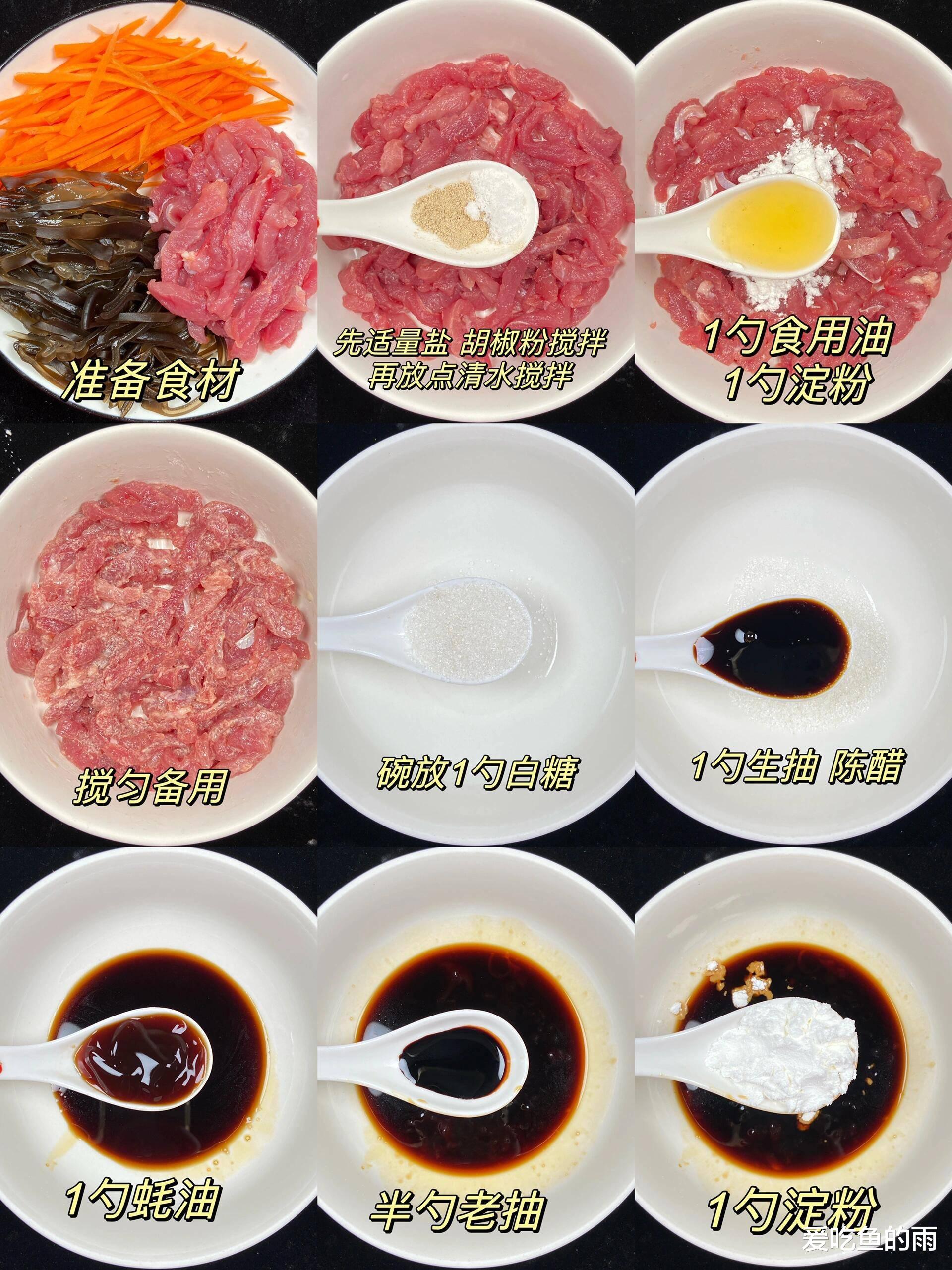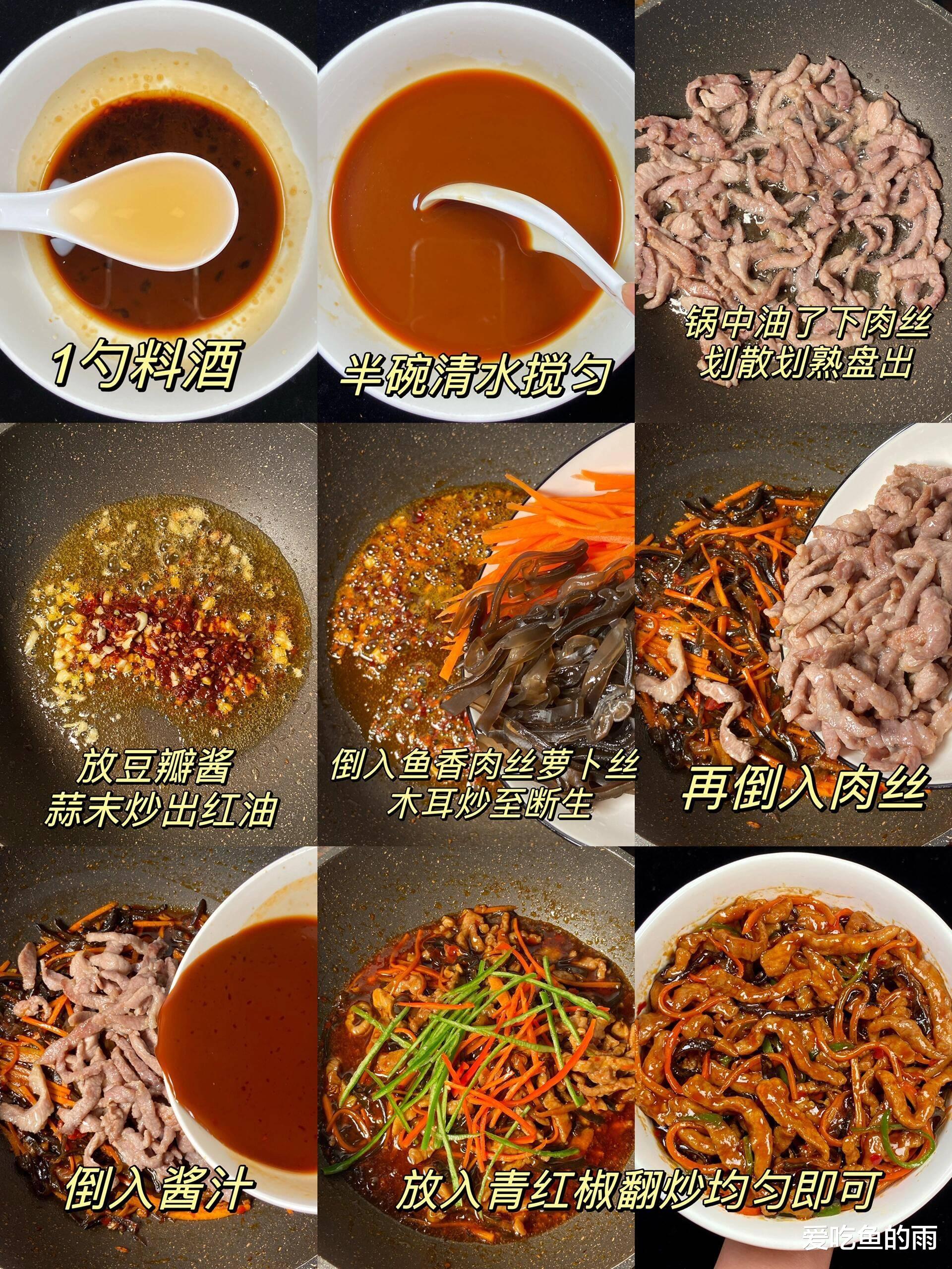 后来跟妈妈学做这道菜,才知道讲究多着呢。肉要选猪里脊,冻半硬时切丝,用料酒、淀粉抓匀腌十分钟,这样炒出来才嫩;木耳得用冷水泡发,脆生生的;胡萝卜和青椒切细丝,既能配色又能增加口感。最关键的是“鱼香汁”——泡椒要剁碎,姜蒜切末,糖、醋、酱油、淀粉按比例调匀。妈妈说:“糖要比醋多一点,酸中带甜才叫鱼香;泡椒得用四川的,那才够劲儿。”