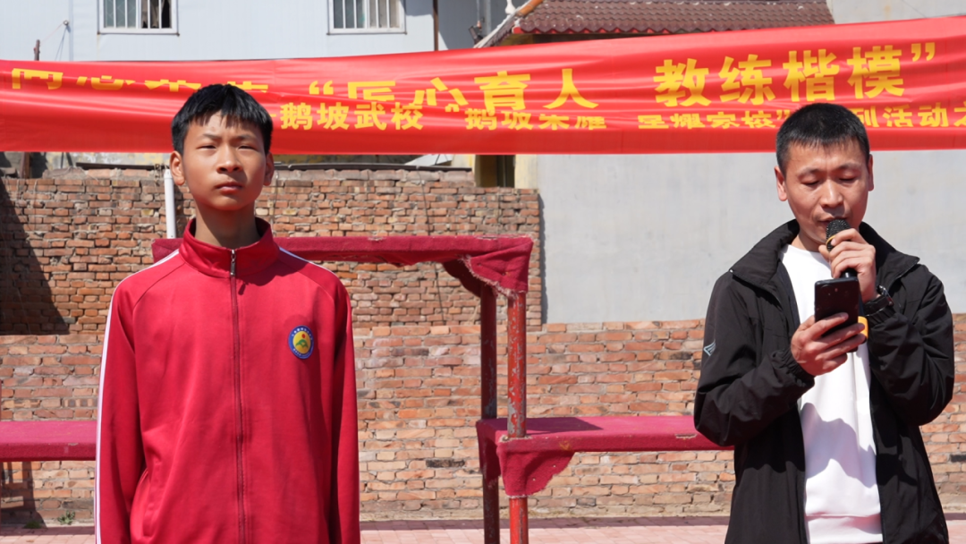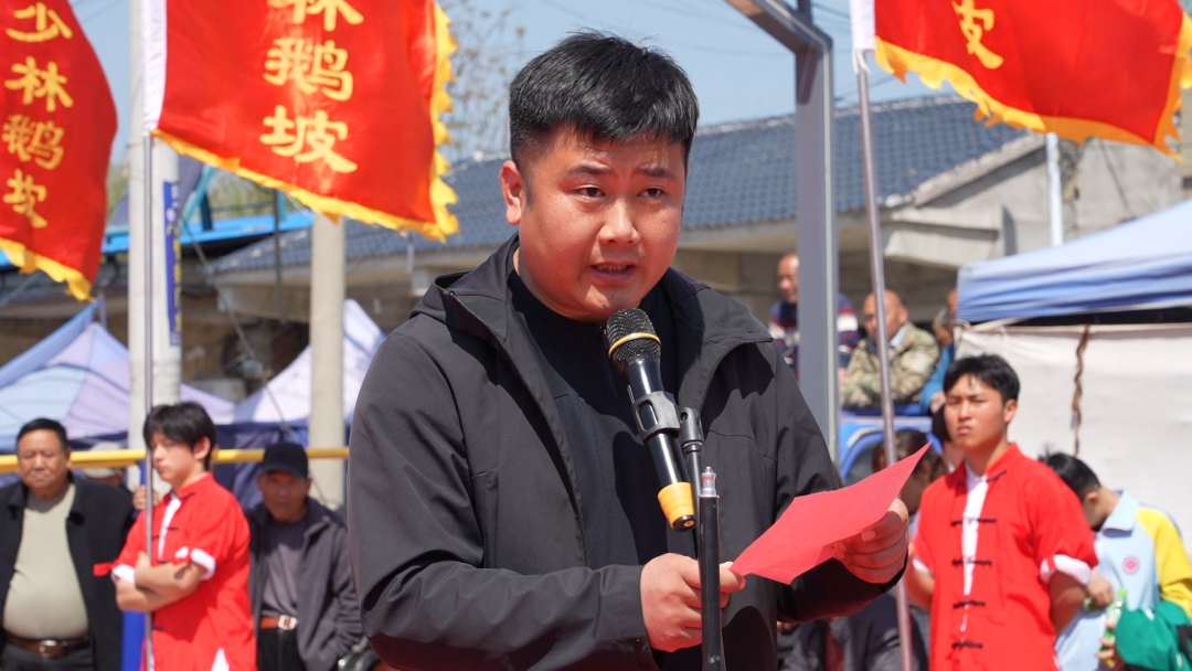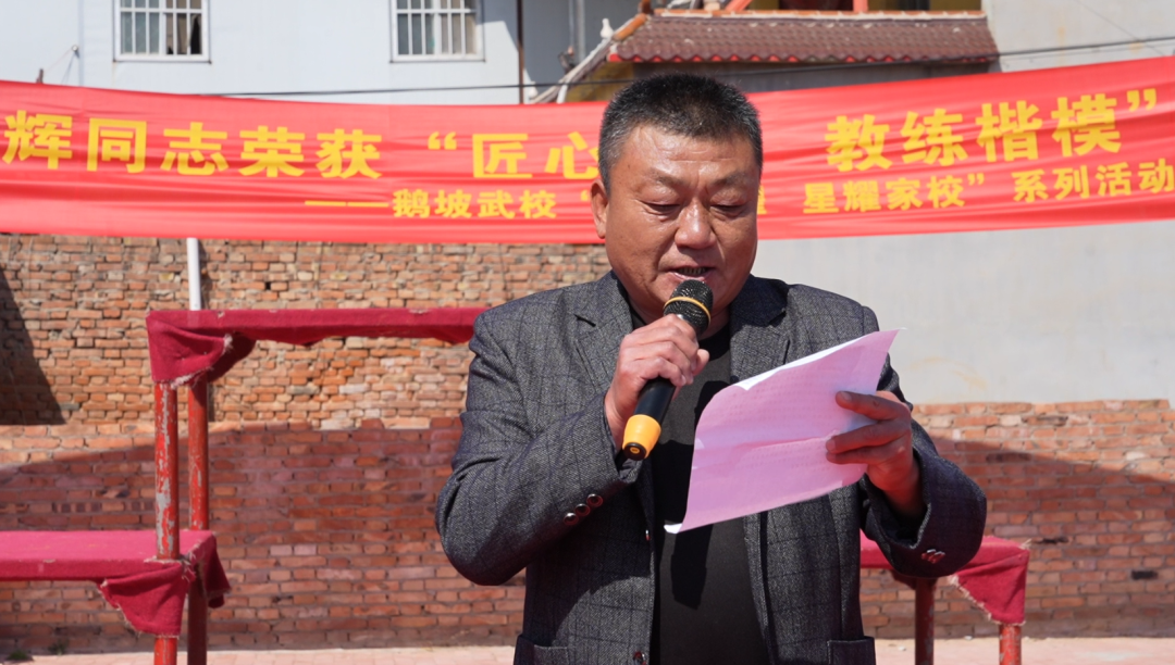 活动伊始,武东辉的父亲致欢迎词。他对远道而来的鹅坡武校一行表示感谢。他讲到,东辉2009年进入鹅坡武校,从懵懂少年一步步成长为教练、部长,实现人生价值,作为父亲倍感欣慰与光荣。学校不仅送来荣誉,还精心准备节目回馈乡亲,充分体现了鹅坡尊师重教、心系社会的深厚情怀。他表示,他和家人会一如既往全力支持孩子的工作,不辜负学校的培养与期望。最后,他祝愿鹅坡武校越办越好,祝全体鹅坡人、乡亲们身体健康、万事如意。