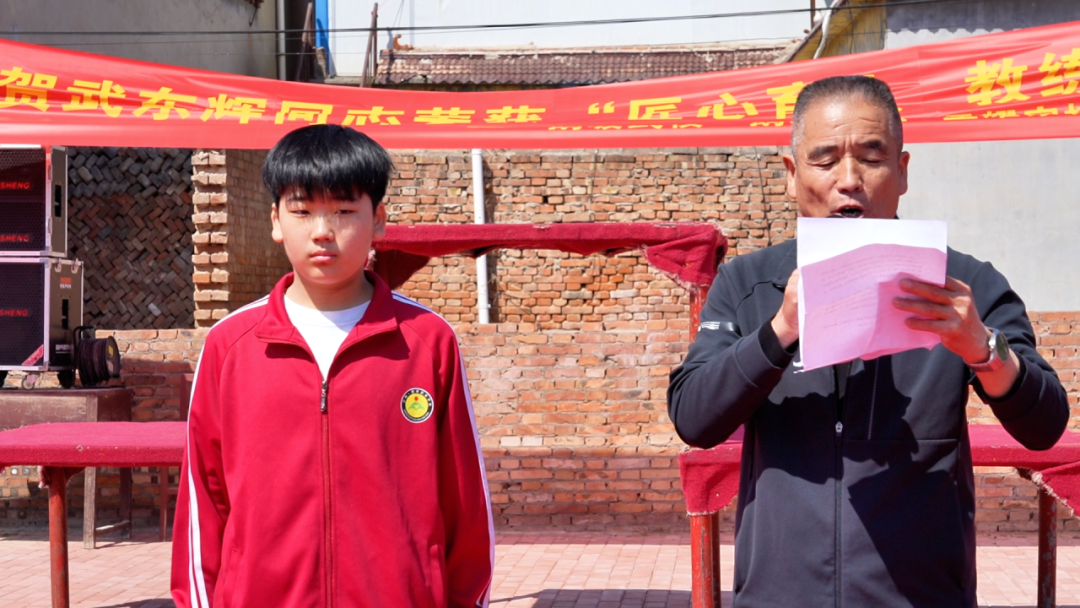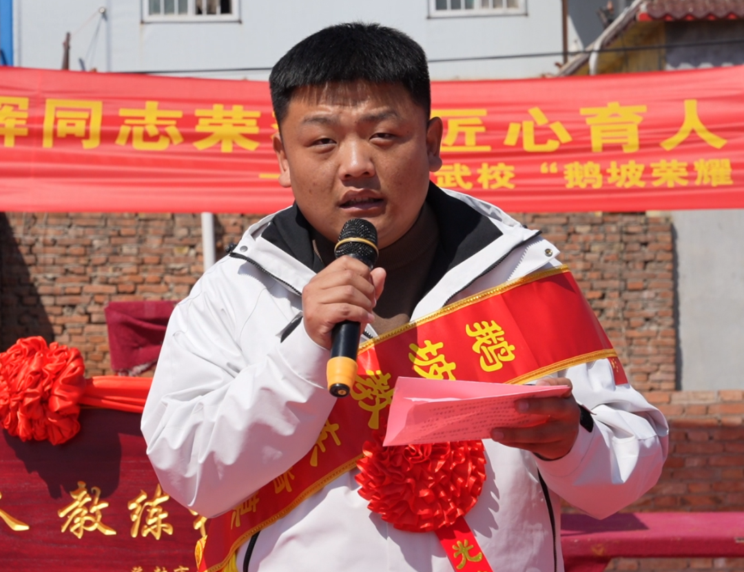 鹅坡武校党总支书记、执行校长常福晓作总结讲话。他对武东辉教练的成长历程给予高度评价,坦言武东辉当年选择武术、选择鹅坡,找准了适合自己的人生道路,从曾经调皮的学生,成长为如今武术教育领域的佼佼者,离不开他自身吃苦耐劳、踏实肯干的优良品质。常校长代表梁校长向武东辉表示热烈祝贺,并提出三点殷切期望:期待武东辉在今后的工作中再接再厉、越来越好;期待他当好家乡的“代言人”,为六塔集村的发展贡献力量;期待他深耕武术教育领域,在人才培养、武术传承和鹅坡武校发展壮大的道路上,书写更精彩的篇章、作出更大的贡献。