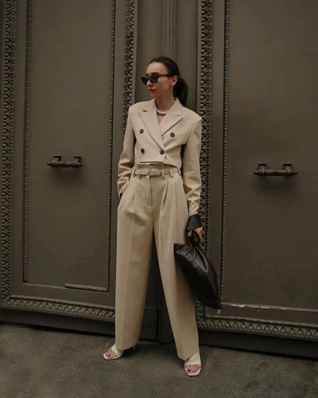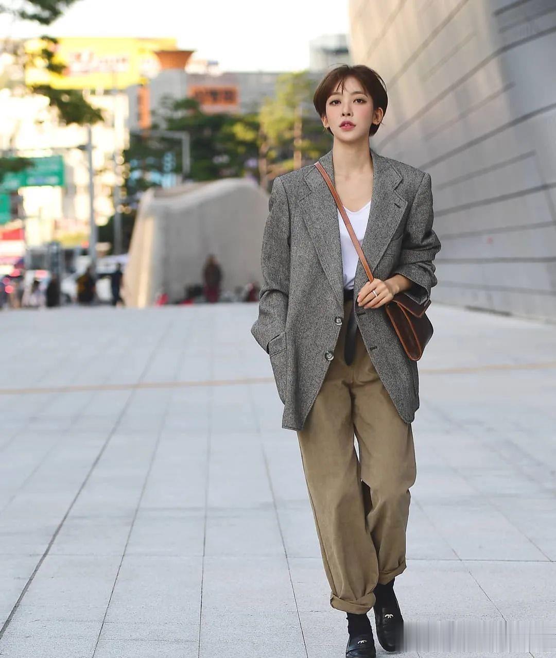 三、廓形西装:知性干练的"万能公式",通勤逛街的双重身份如果说前两种单品是"风格表达",那么廓形西装就是"身份象征"。在陆家嘴的写字楼里,几乎每个白领都拥有一件廓形西装——它既能应对重要会议的正式场合,又能搭配牛仔裤去逛街。这种"一衣多穿"的智慧,正是上海职场女性的生存哲学。