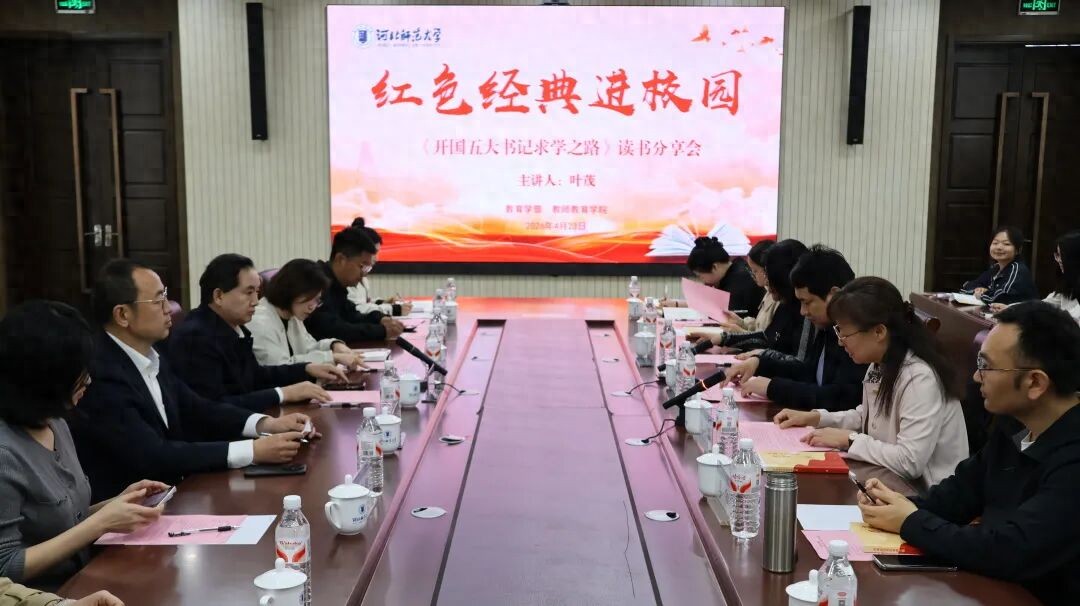上午,“红色经典进校园”——《开国五大书记求学之路》读书分享会在会议中心第二会议室举行。活动特邀书作者叶茂主讲。省委政研室、省委改革办《河北发展》编辑部主任苗峰,教师教育学院院长潘新民,专业教师王骞、李阳及60余名师生参加分享交流。