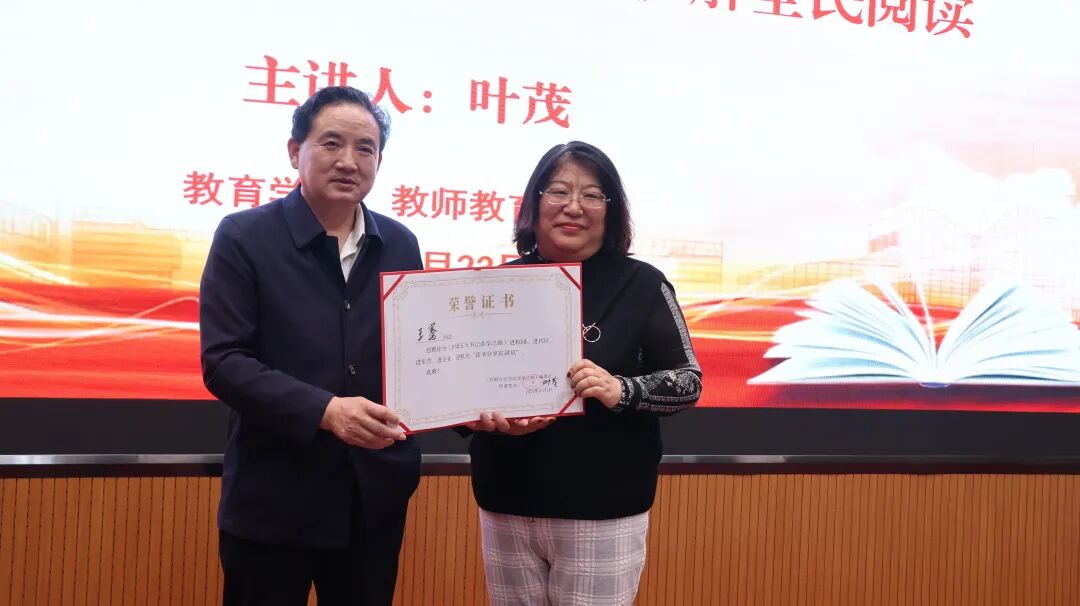 潘新民对叶茂一行的到来表示欢迎和感谢,详细介绍了学院师范生培养的特色举措和读书月系列活动的开展情况。他希望同学们要以书为友,涵养终身阅读的良好习惯;以史为鉴,传承革命先辈的红色求学精神;以践为径,锚定知行合一的成长航向,推动全院形成爱读书、读好书、善读书的浓厚氛围,为教师教育高质量发展、教育强国建设贡献青春力量。