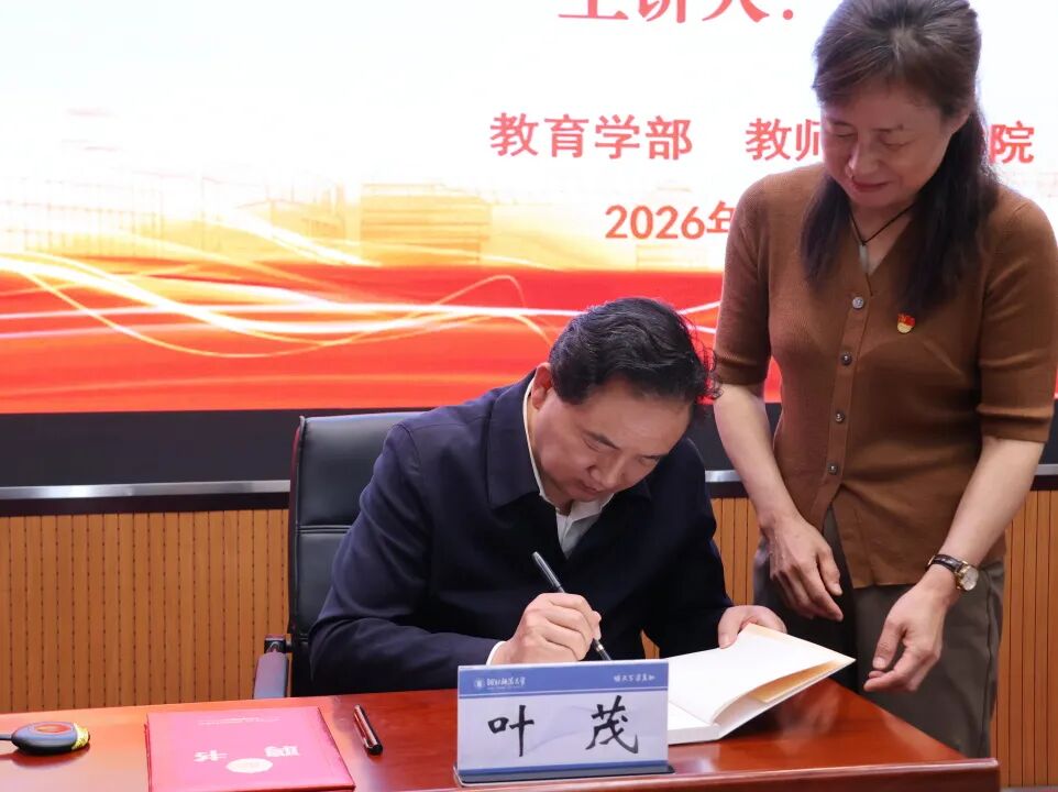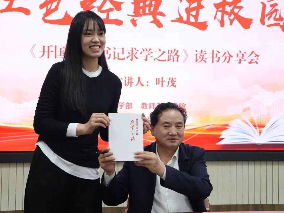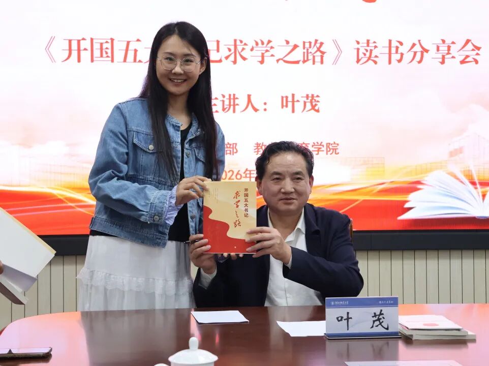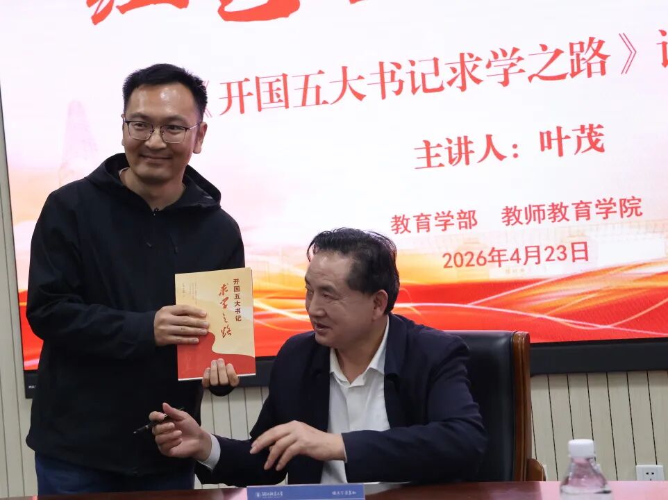 叶茂结合自身多年深耕党史、国史的研究经验,深情讲述了《开国五大书记求学之路》的创作缘起、打磨过程,并从历史传承与现实启示的维度,解读作品引发的社会共鸣及当代意义。他勉励同学们坚守阅读初心,甄选兼具思想性、指导性的优秀书籍,深耕专业知识、锤炼过硬本领,主动扎根基层一线、践行教育使命,立志成为传道授业解惑的新时代“大先生”。