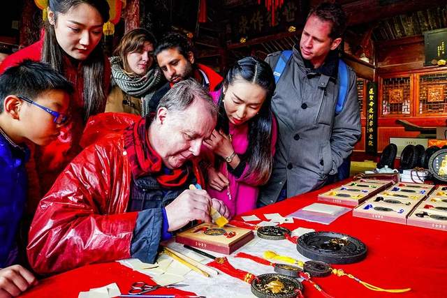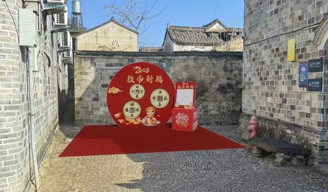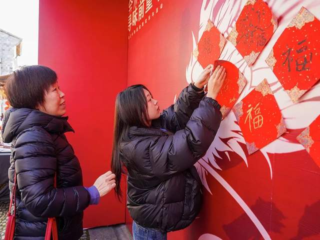通过这扇福门,新年的福气马上到!现场提供毛笔和红纸,写下“福”字,在古镇留下福迹。