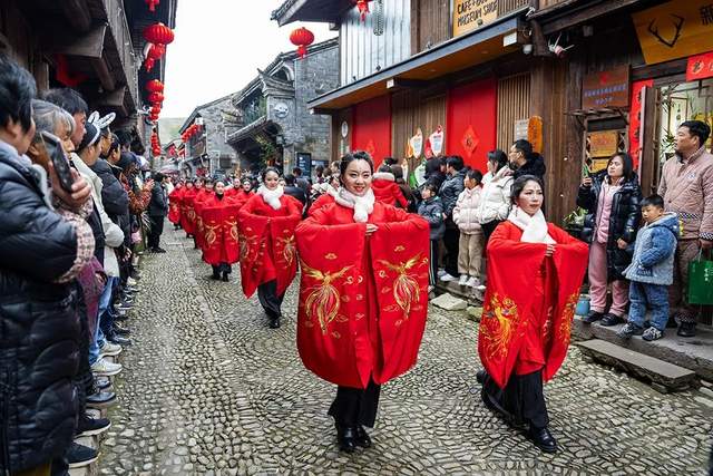 朝喜迎春、好运东方。前童古镇张灯结彩、汉服列队,重现古代宫廷“排正仗”之盛况。鼓乐齐鸣,旗幡飘扬,“格莱美”捕捉瞬间美好。古镇之内,祈福圣地,霓裳华服秀惊艳登场。