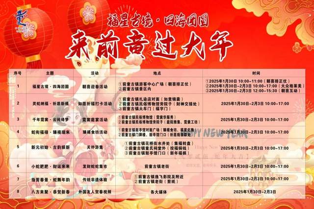 祥龙摆尾辞旧岁,金蛇纳福启新程。福星照耀古境前童,四海宾朋共聚一堂,欢庆新春佳节。2025年1月30日-2月3日(正月初二至正月初六),前童古镇诚邀八方来客过大年!