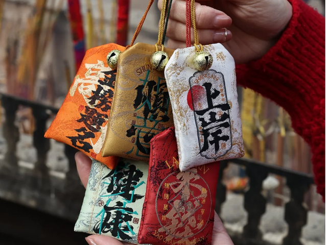 如意锦囊墙上挂满了各式各样的新年祝福锦囊。活动期间,大家可随意挑选锦囊,敲打旁边的铜铃,大声喊出“如意如意”,将心中的愿望传递给新的一年,活动期间每日限量200个锦囊可免费领取!
