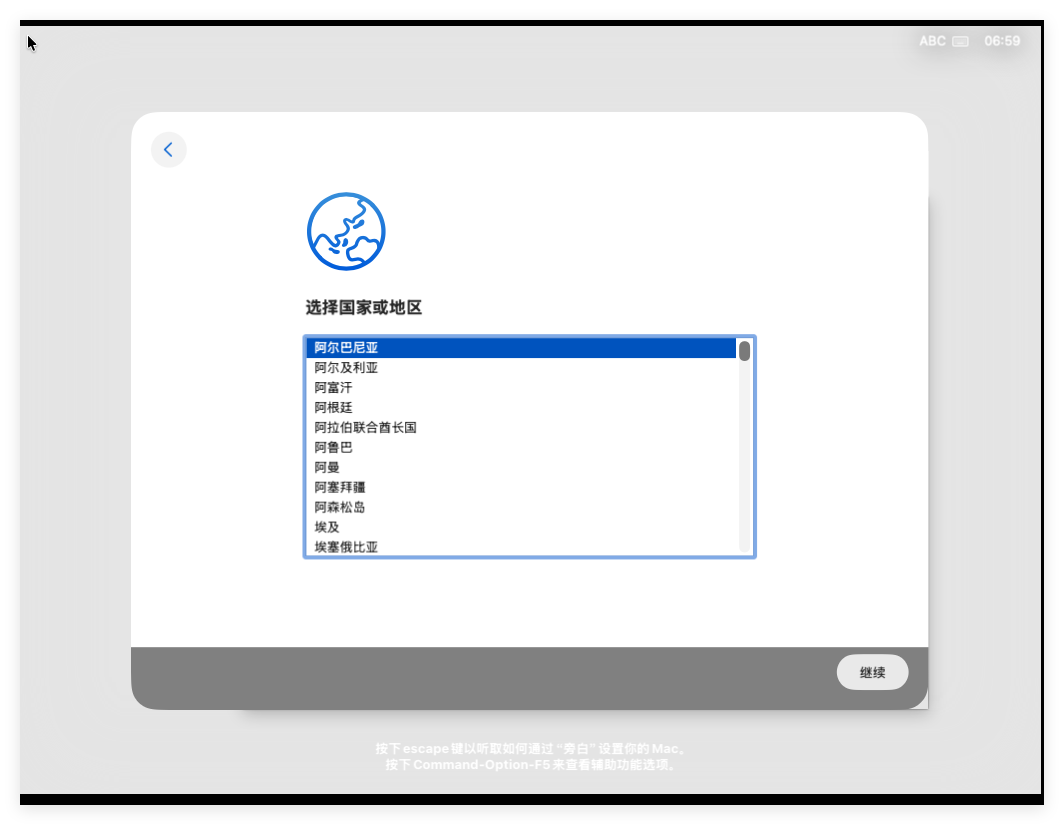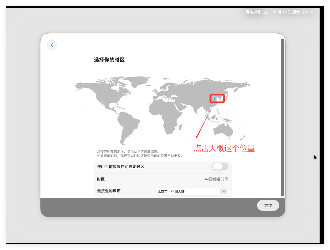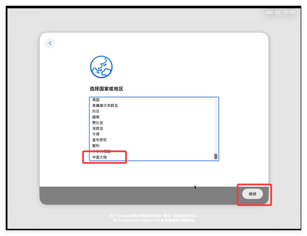 此处需要选择国家或地区,此处选择“中国大陆”后点击“继续”: