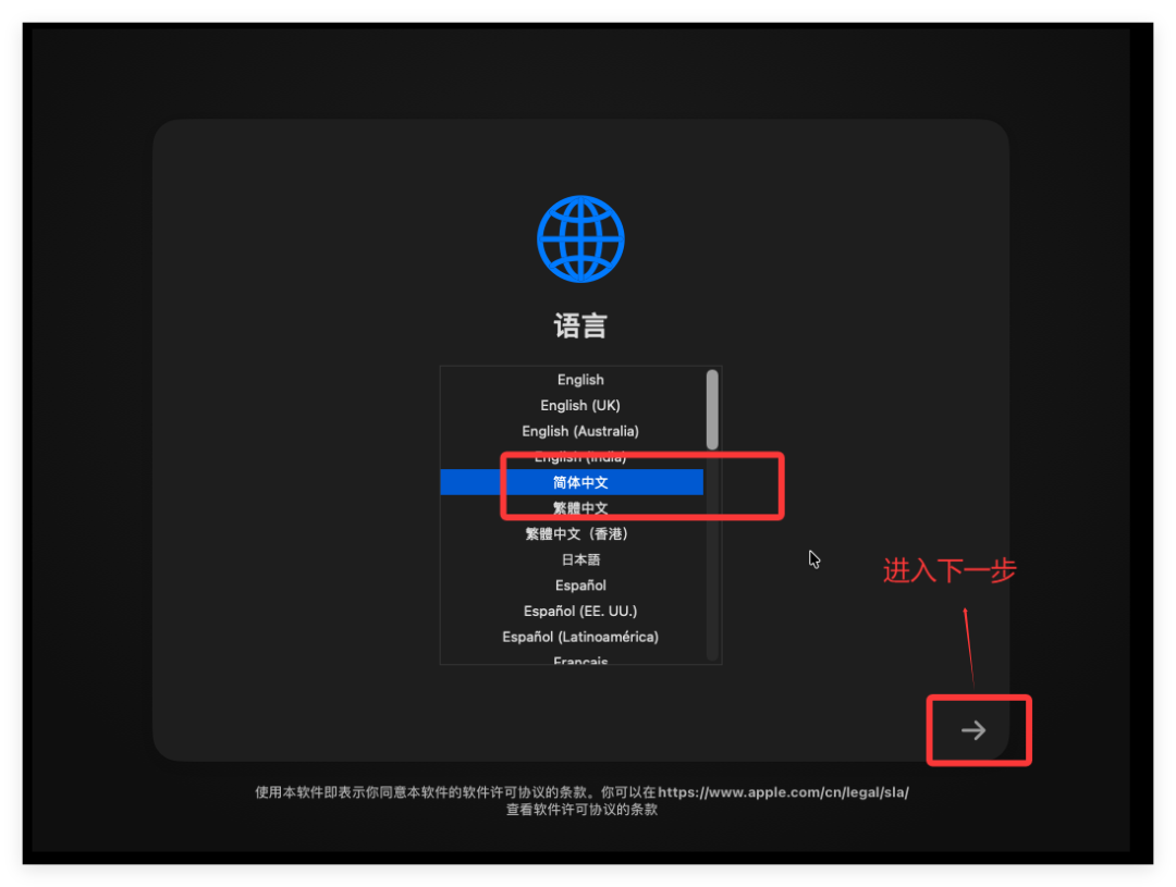 此处选择“简体中文”后,点击右侧的箭头进行下一步: