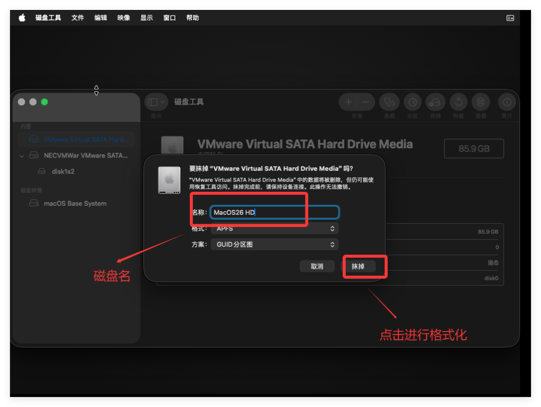 这里填写磁盘名字,如:"MacOS26 HD",并点击“抹掉”: