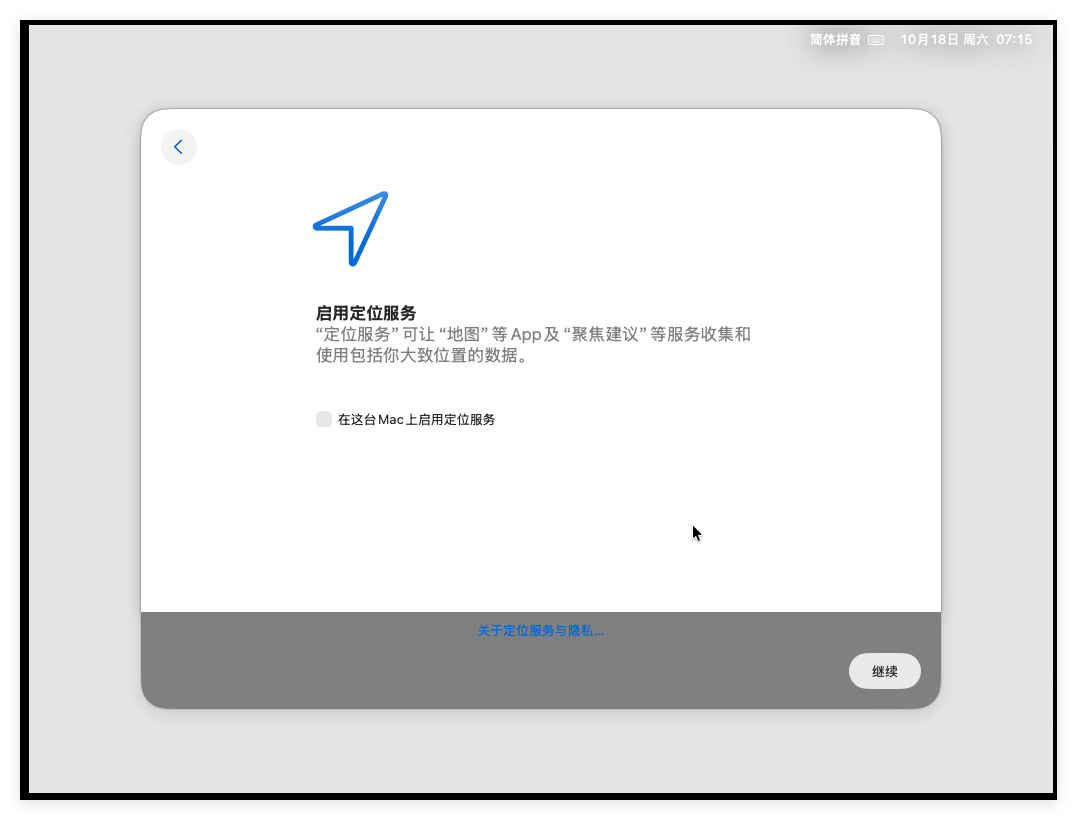 点击“同意”后开始配置是否启用定位服务,这里不做任何改动,直接“继续”: