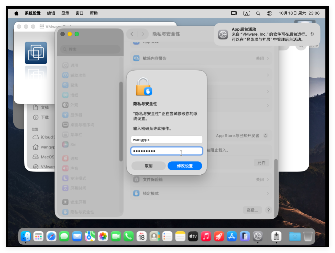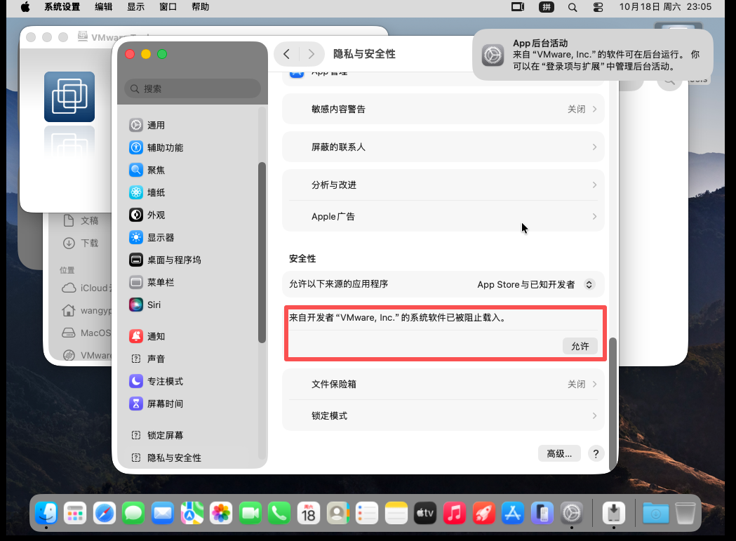 输入密码后开始进行安装,此时会被隐私与安全拦截,只需要在如下页面设置“允许”即可: