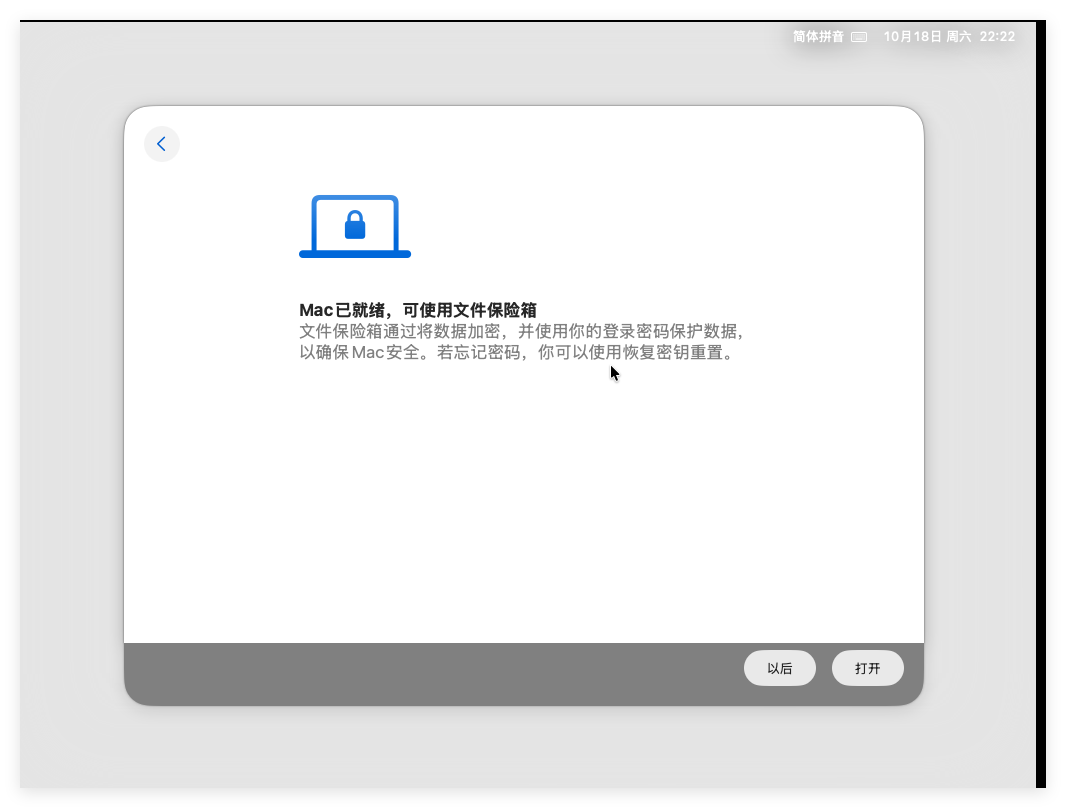 点击“稍后设置”后询问是否使用文件保险箱,这里按需选择,我选择“以后”: