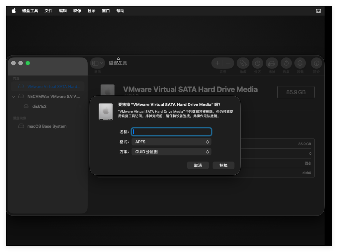 在磁盘工具页面选择第一个“VMware Virtual SATA Hard Drive Media”,并选择“擦除”: