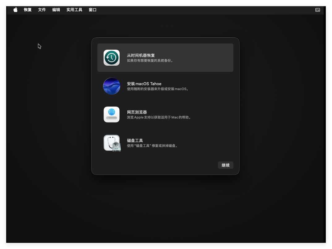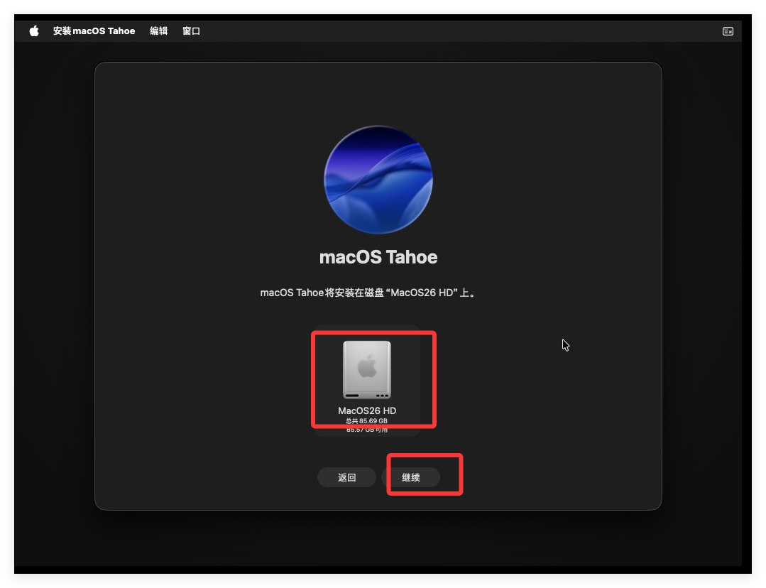 在磁盘格式化后,选择“MacOS Tahoe”,并点击“继续”: