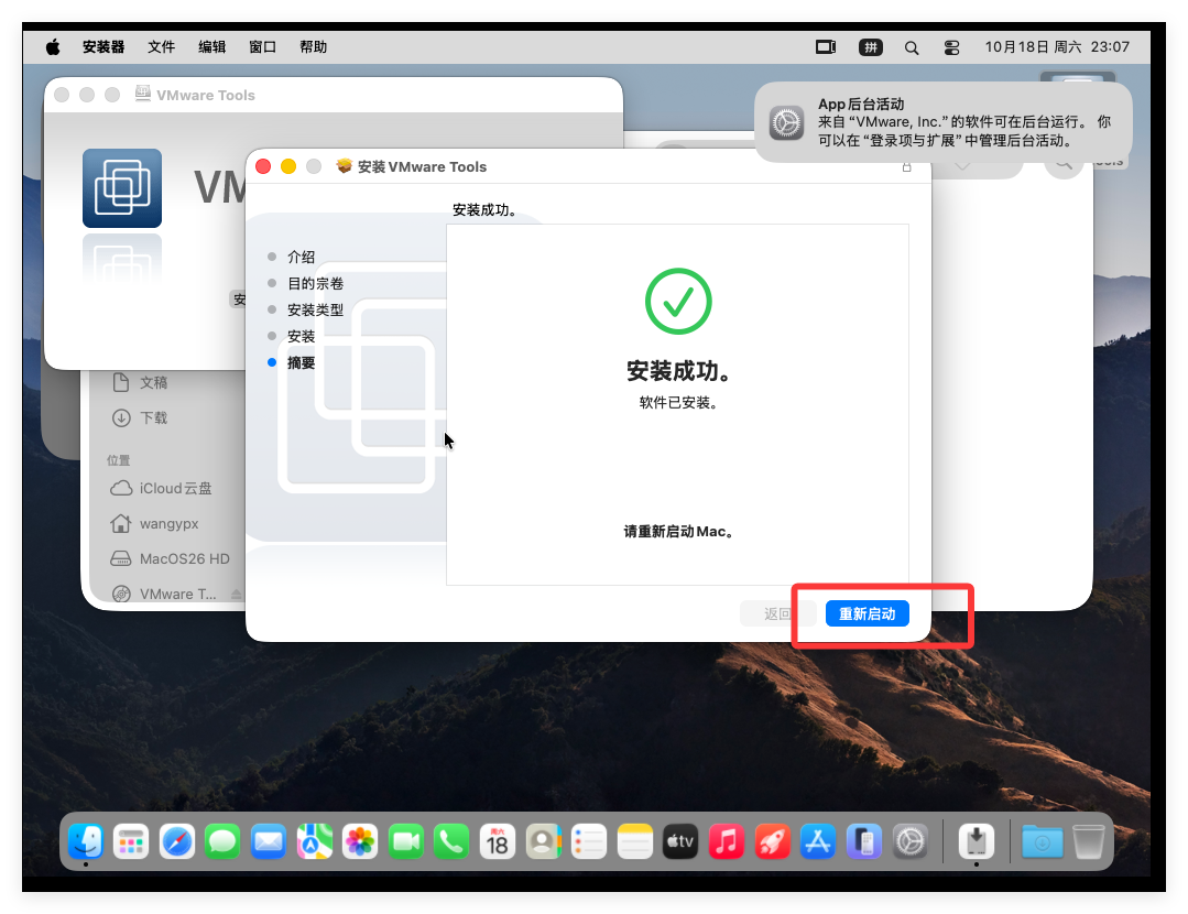 允许后等待一会,VmTool 便已安装完成,并提示需要重新启动: