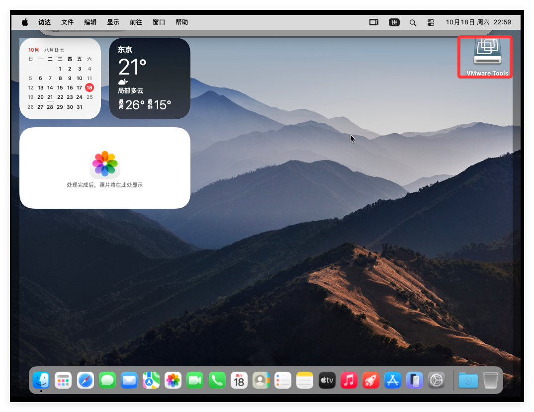 桌面背景白屏是因为虚拟机安装的苹果无法支撑动态效果,只需要将壁纸改为静态图片即可,下面是更换后桌面情况: