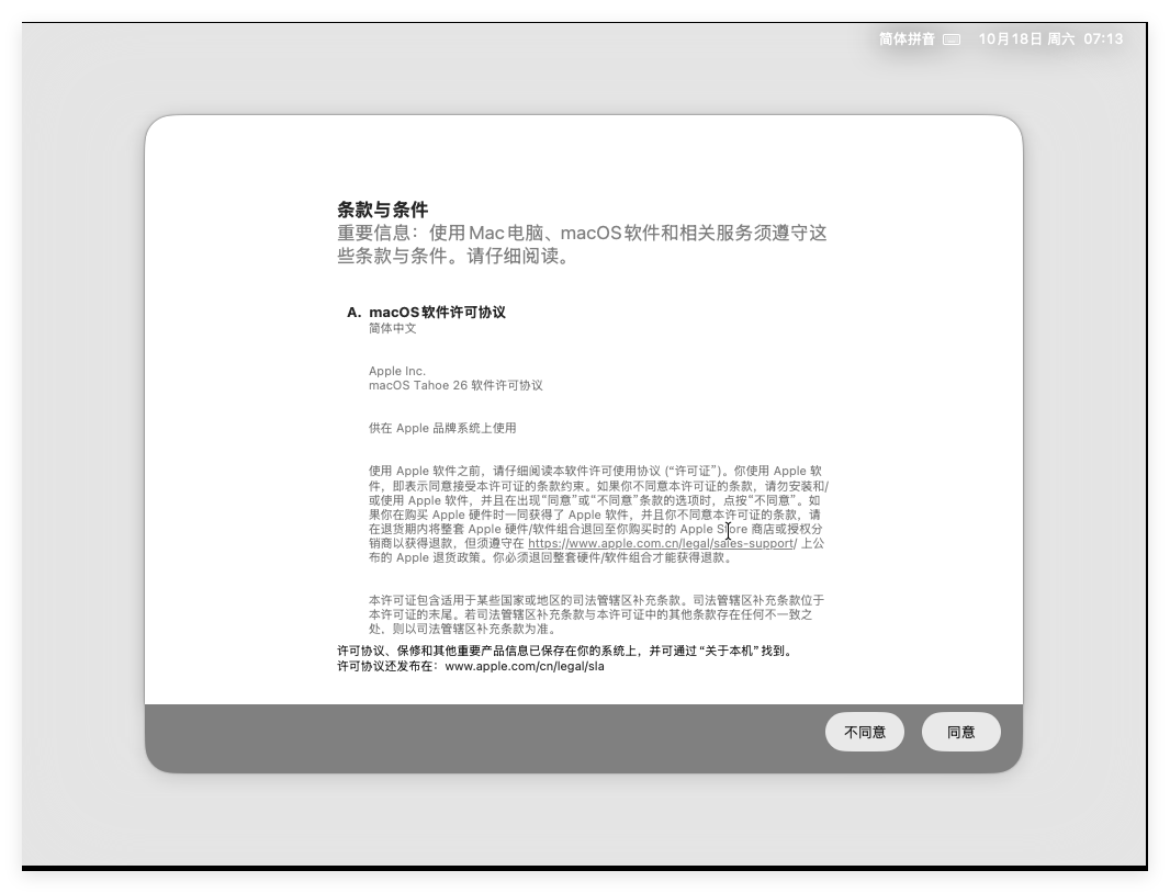 点击“继续”后开始询问是否接受协议,这里选择“同意”: