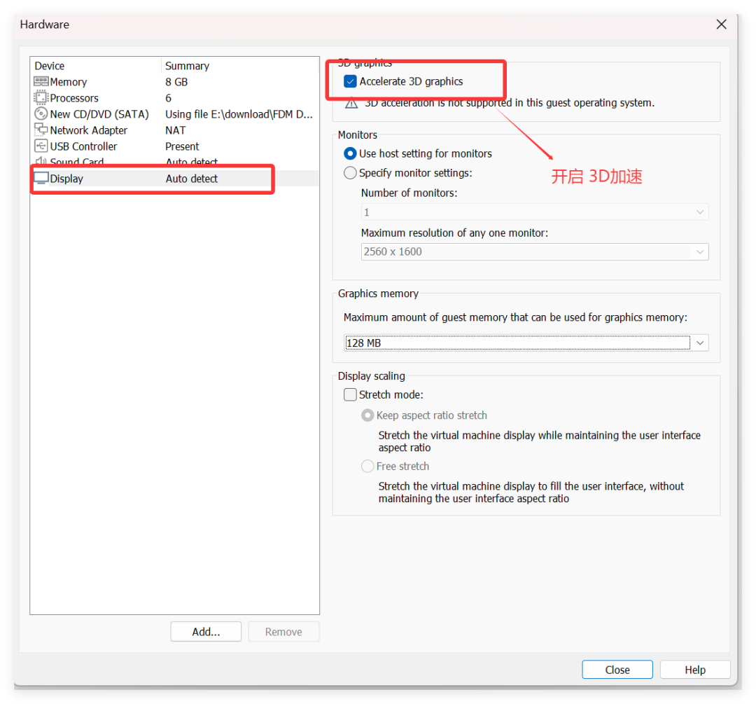 可看到,默认分配的内存为 8G, CPU 为6核,已经足够使用,接着选择“New CD ./ DVD”指定刚才下载的 MacOS 26镜像,同时修改 “Display”,将 3D加速开启: