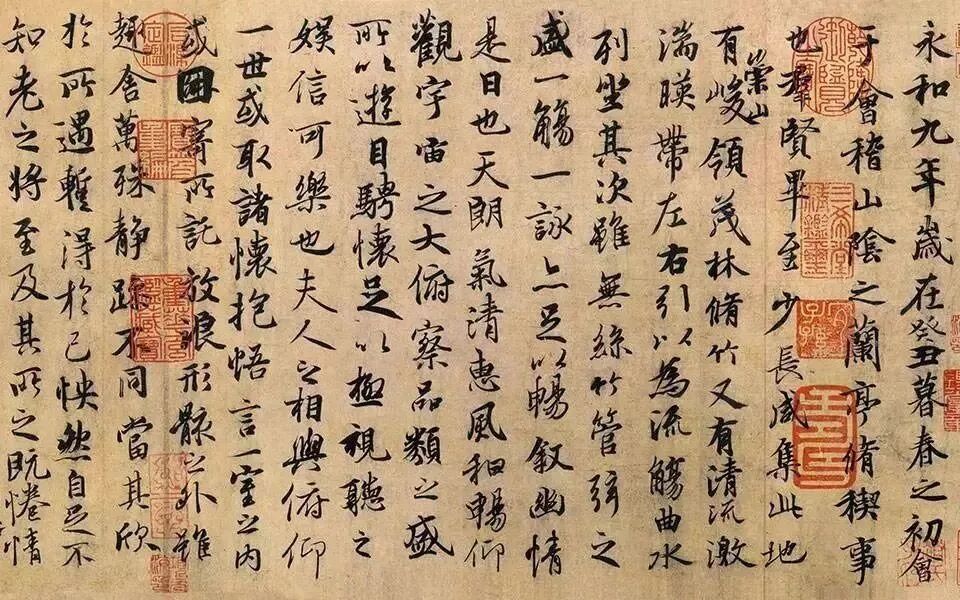 晋穆帝永和九年(353),王羲之与谢安一众42人雅集兰亭,流觞曲水,赋诗怡情,各有所咏。酒酣耳热之后,众人拟将诗作结集,共推王羲之为序。右军先生欣然命笔,洋洋洒洒,有如神助,文墨高妙,为后人留下传颂千古的书法和散文名篇。